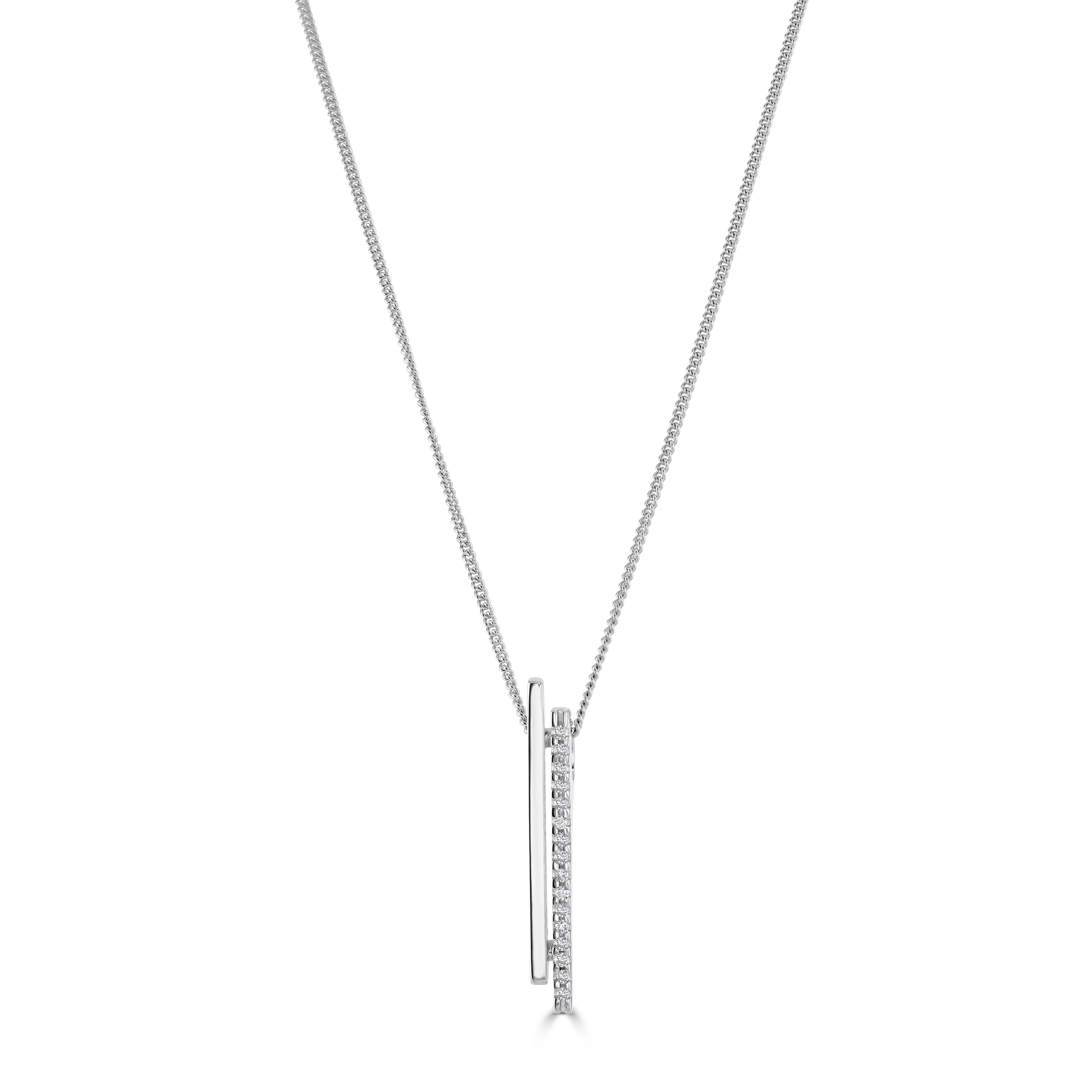 Introducing our striking 18ct white gold pendant, featuring two elegant vertical bars—one adorned with shimmering diamonds. This sophisticated piece is suspended from a delicate 18ct white gold 16-inch curb chain, enhancing its allure. The diamond-set bar sparkles with a total diamond weight of 0.08ct, adding a subtle yet captivating glow to any outfit. Perfect for those seeking a piece of jewellery that combines modern elegance with a touch of timeless glamour, this pendant is designed to impress. Whether dressing up for a special occasion or adding a luxurious touch to your everyday style, this white gold pendant with its exquisite diamond detailing is an impeccable choice.
