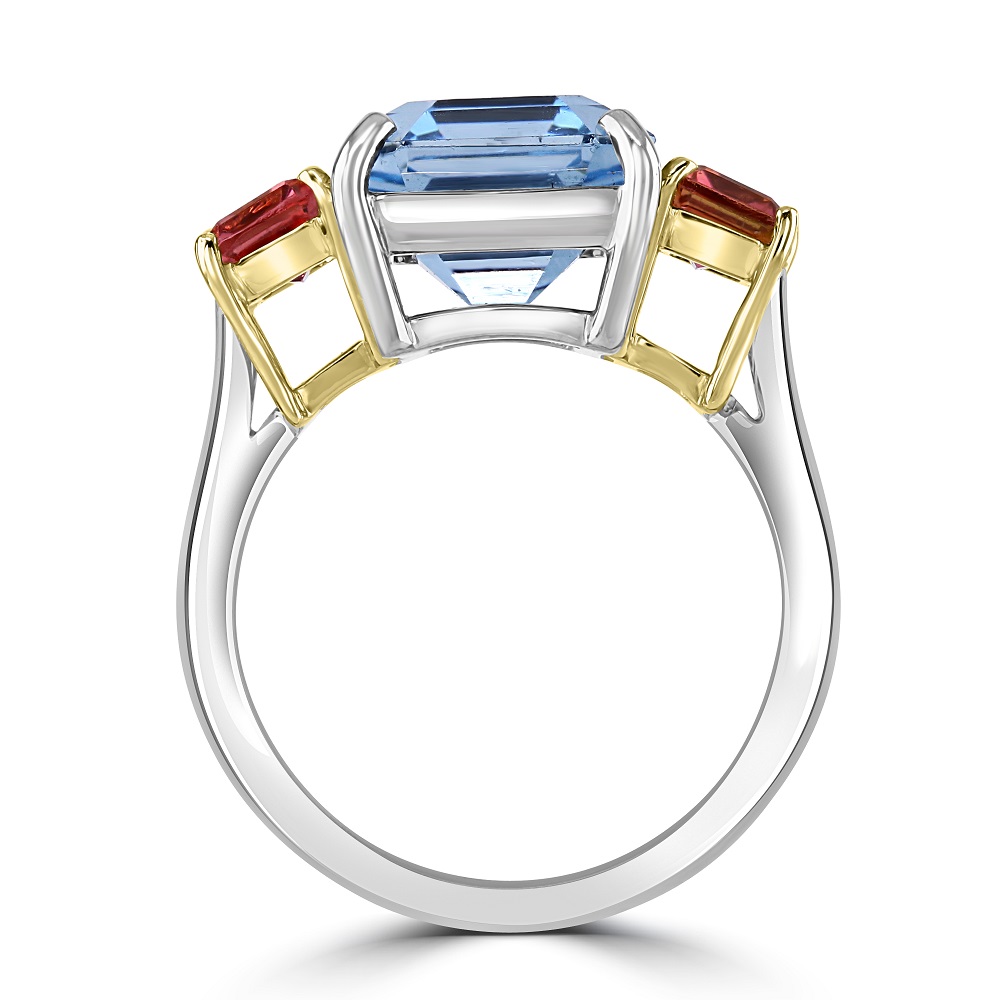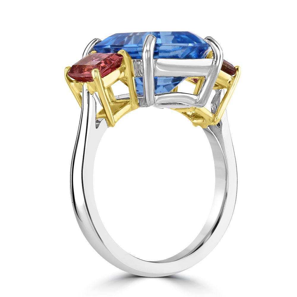 Discover the epitome of elegance with our stunning 18ct white and rose gold trilogy Ring, featuring a breath taking centre octagon cut Blue Topaz, securely held by four claws, and flanked by two equally mesmerizing octagon cut Pink Tourmalines, each also claw set. The Blue Topaz, weighing an impressive 7.0ct, radiates a serene blue hue, symbolizing tranquillity, and calmness. Complementing this, the Pink Tourmalines on either side have a combined weight of 1.20ct, adding a touch of warm vibrancy and sophistication to the piece. This exquisite ring perfectly blends the contemporary allure of white and rose gold, creating a harmonious and captivating look that's both timeless and modern. Crafted for those who appreciate the beauty of coloured gemstones framed in luxurious gold, this ring is a masterpiece of craftsmanship and style. Make a statement of refined elegance with this unique three-stone ring, where the contrasting colours and the brilliance of the gemstones come together to create a piece of unmatched beauty and allure.Top of Form