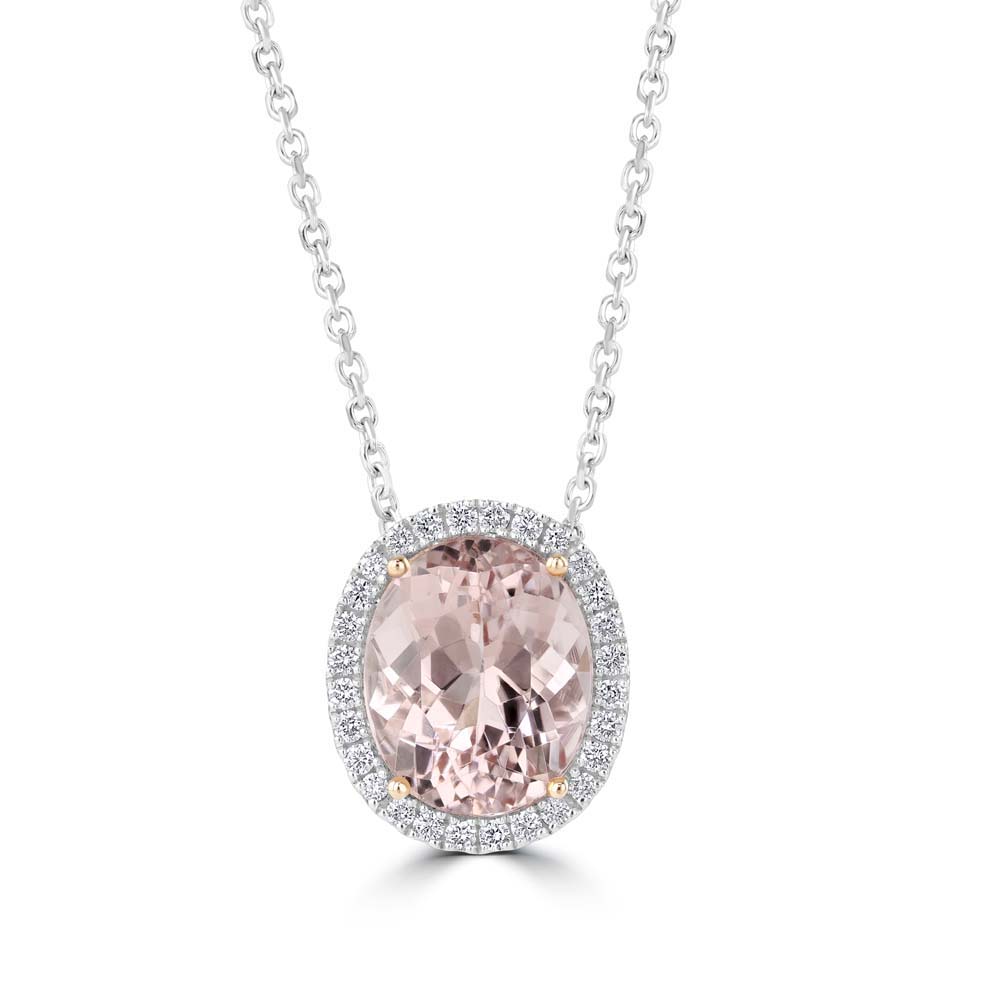 A breathtaking 18ct white gold pendant, radiating warmth and elegance with every detail. At its centre lies a stunning oval cut morganite, weighing an impressive 3.95 carats, held securely in four delicate rose gold claws that beautifully complement the gemstone’s soft blush tones. Surrounding the morganite is a halo of round brilliant cut diamonds, totalling 0.20 carats, adding a refined sparkle that enhances the pendant’s romantic charm. The piece is suspended from a 16-inch 18ct white gold trace chain, designed to sit gracefully at the neckline and highlight the pendant’s exquisite craftsmanship. A perfect blend of modern luxury and timeless femininity, this pendant is an ideal choice for those who appreciate sophisticated design and the gentle allure of pastel gemstones.