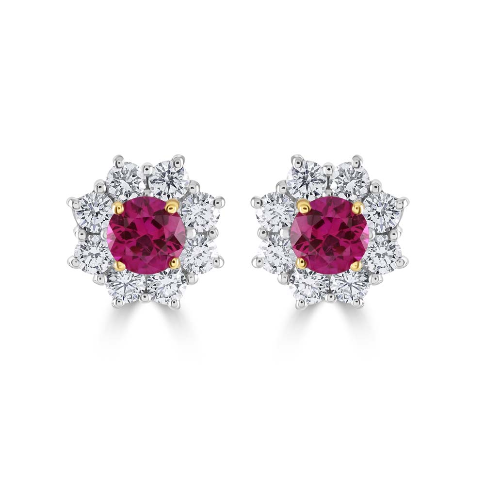 A timeless expression of colour and brilliance, these 18ct white gold stud earrings feature a captivating centrepiece: a round ruby, securely held in a yellow gold 4-claw setting that enhances its rich, fiery hue. Surrounding each ruby is a radiant halo of eight round brilliant cut diamonds, meticulously claw set to amplify sparkle and contrast. The combination of white and yellow gold adds depth and sophistication, while the vivid red of the rubies brings warmth and allure. Finished with post and butterfly fittings, these earrings offer both comfort and elegance for everyday wear or special occasions. Classic yet bold, these earrings are a stunning addition to any fine jewellery collection, perfect for those who appreciate timeless beauty with a touch of vibrant colour.