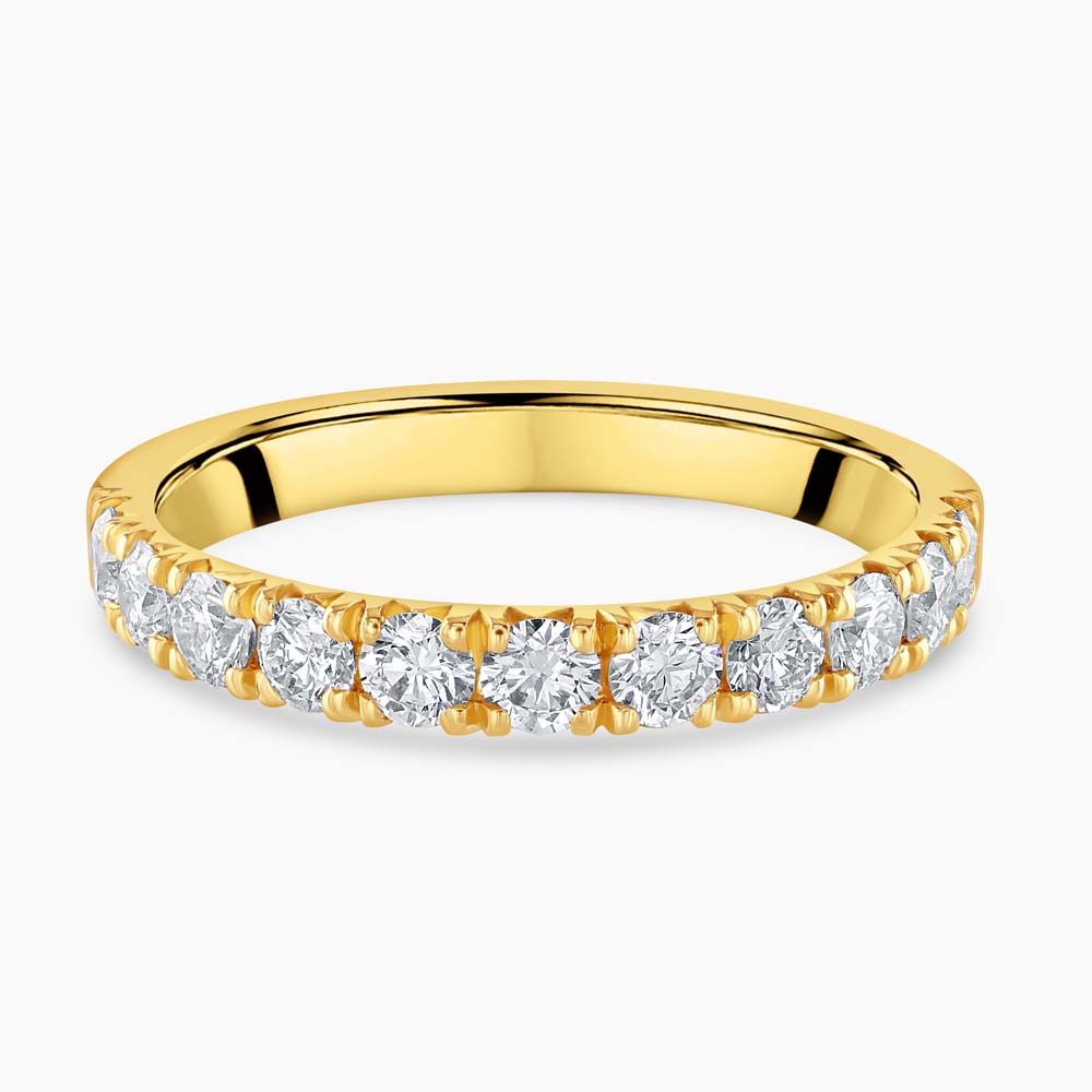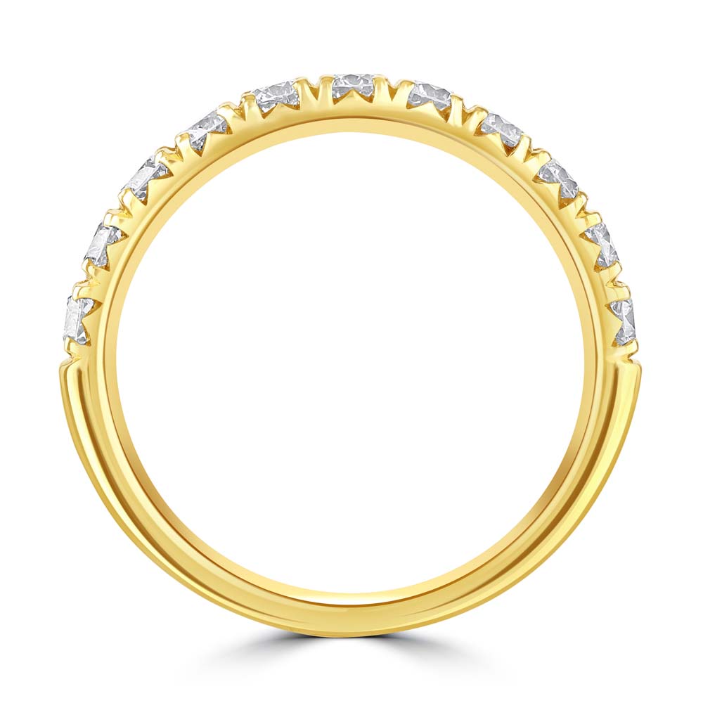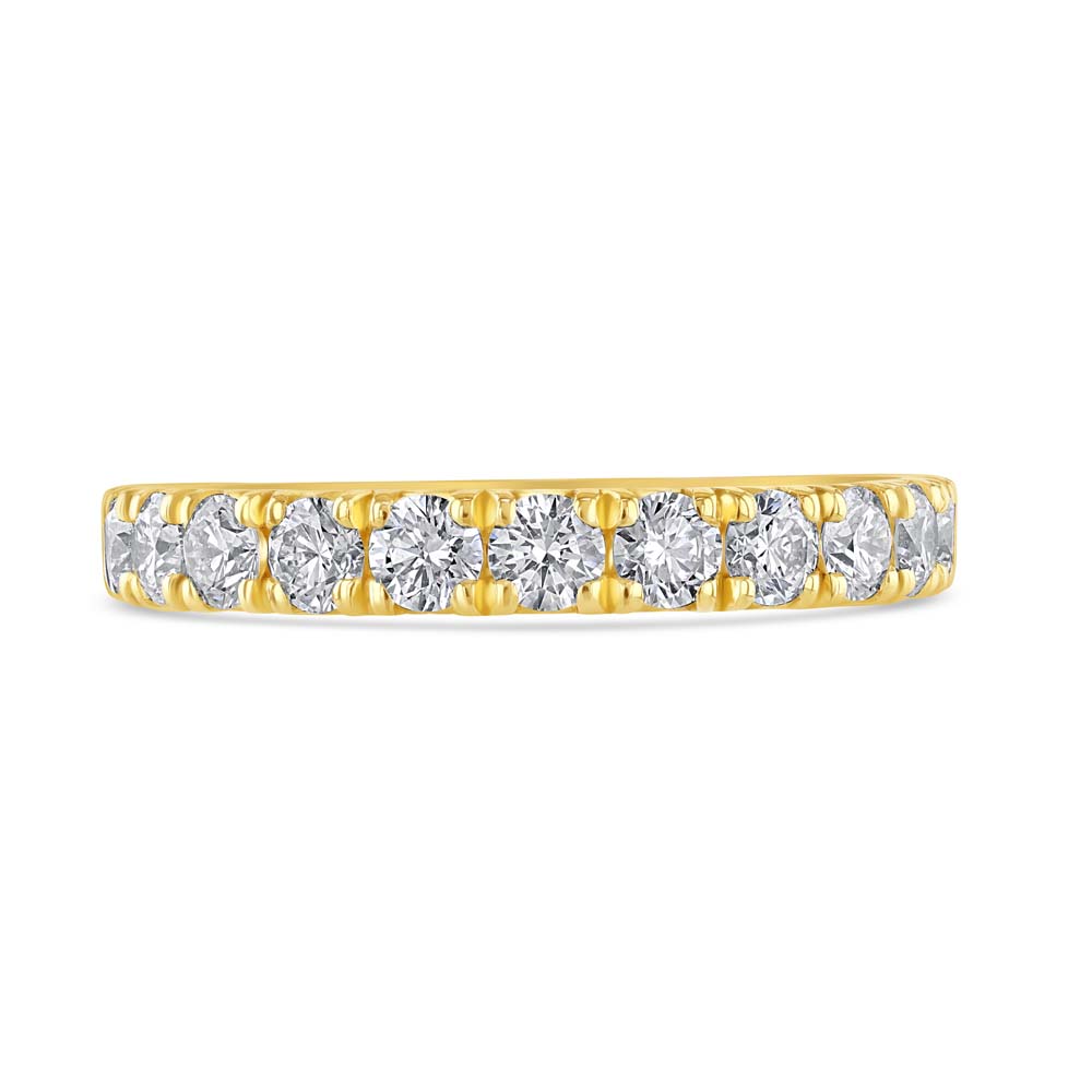 Indulge in timeless luxury with this 18ct yellow gold half eternity ring, featuring eleven round brilliant-cut diamonds in an elegant claw setting. Designed to maximize brilliance and light reflection, this ring offers a perfect balance of sophistication and sparkle. With a total diamond weight of approximately 0.86ct, each diamond is graded G colour and VS2 clarity, ensuring exceptional quality and radiance. Ideal as a wedding band, anniversary ring, or a statement stacking piece, this design embodies classic elegance with a modern touch.
