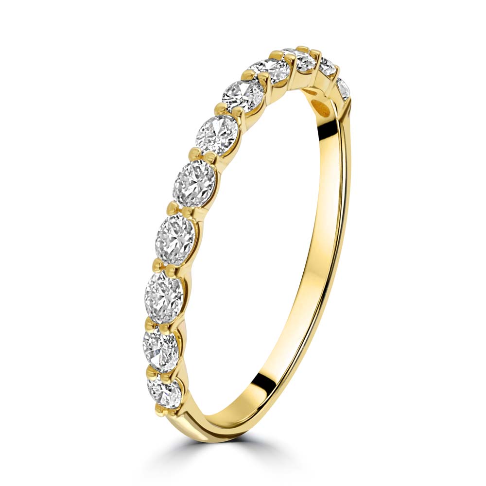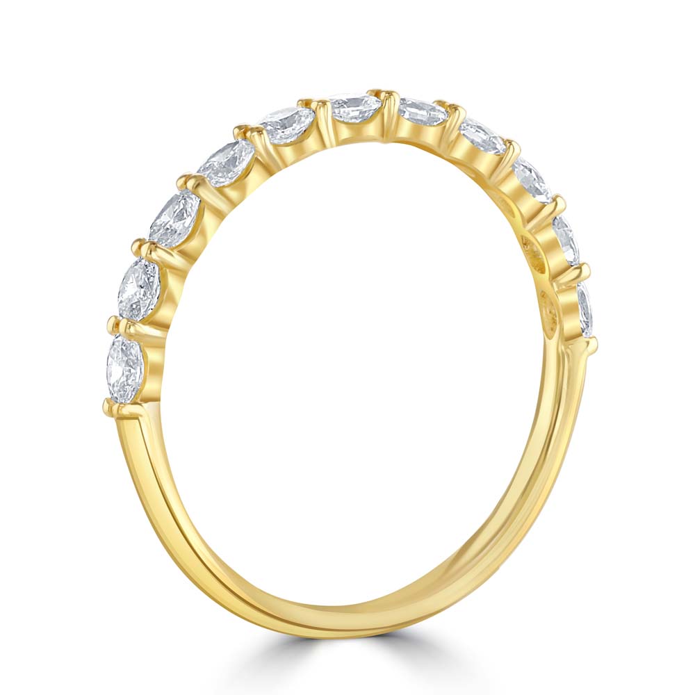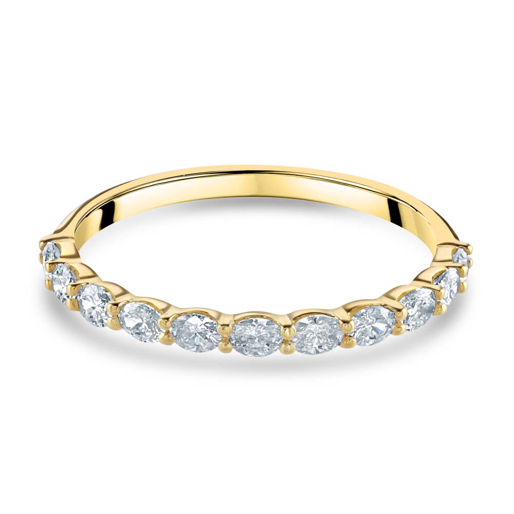 A beautiful 18ct yellow gold half eternity ring, showcasing eleven claw set oval cut diamonds. With a total diamond weight of 0.44ct, this stunning piece exudes elegance and charm, making it a perfect choice for celebrating special moments and milestones.