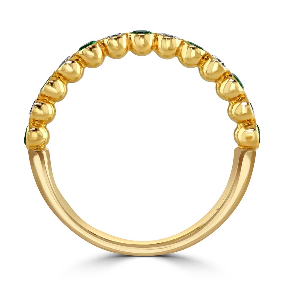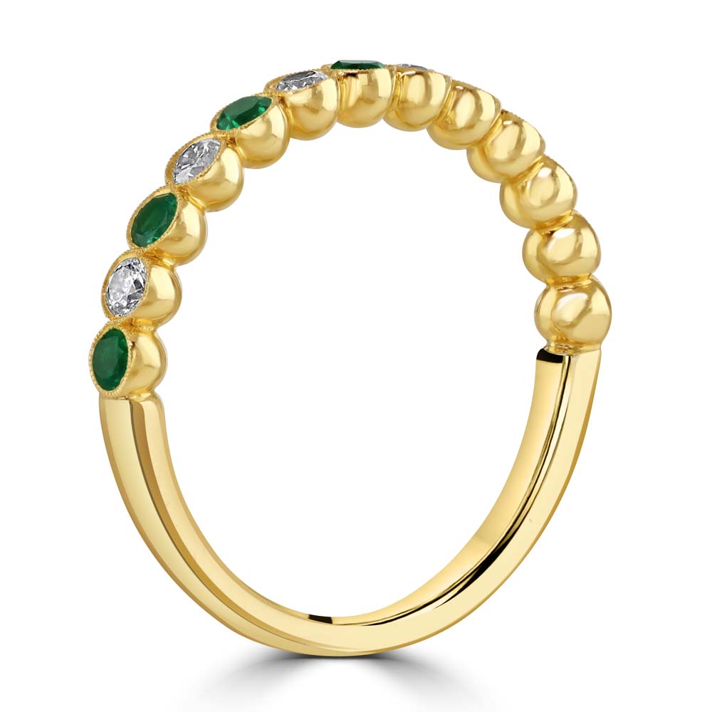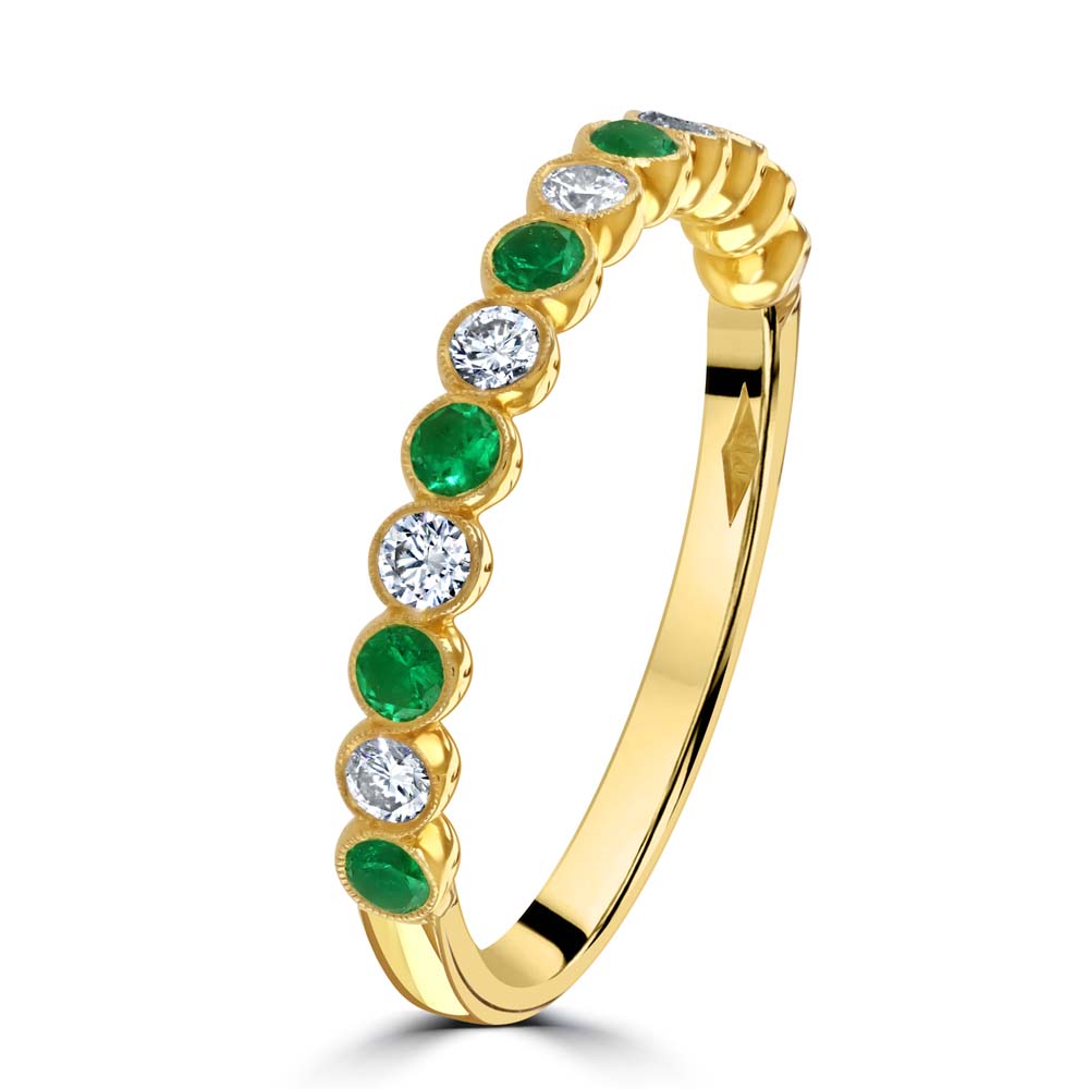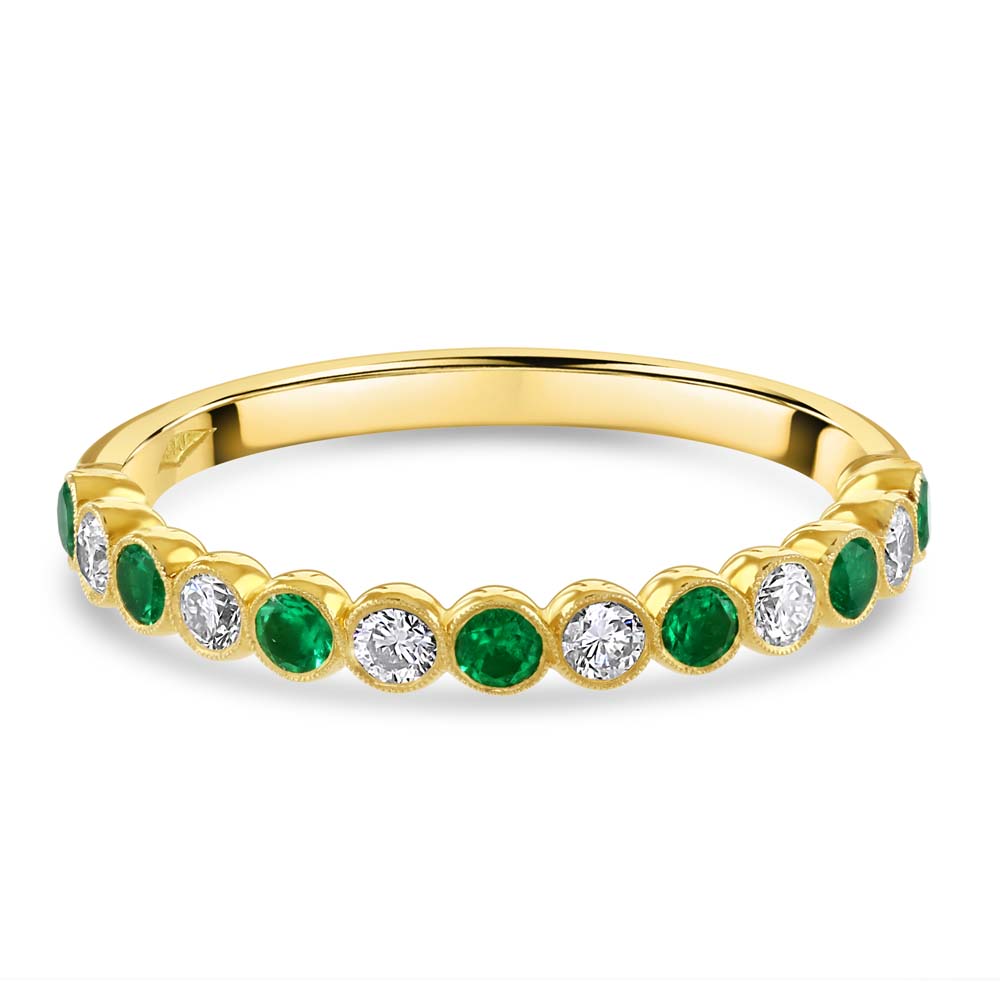 A graceful blend of colour and craftsmanship, this half eternity ring is crafted in rich 18ct yellow gold and features alternating round emeralds and round brilliant cut diamonds, each securely rubover cup set for a smooth, contemporary finish. The design is beautifully framed with a delicate milgrain edge, adding a touch of vintage-inspired detail. With a total emerald weight of 0.25ct and diamond weight of 0.23ct, this ring offers a harmonious balance of vibrant green and sparkling brilliance. The diamonds are graded G for colour and VS2 for clarity, ensuring exceptional quality and radiance. Perfect for stacking, gifting, or marking a special moment, this elegant ring is a timeless addition to any jewellery collection.