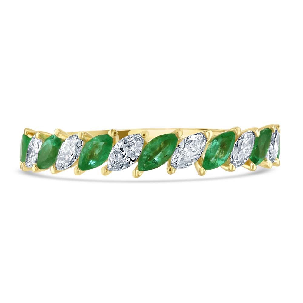 An alluring 18ct yellow gold half eternity ring, a piece that epitomizes luxury and timeless elegance. This captivating ring features an alternating pattern of seven marquise-cut emeralds and six marquise-cut diamonds, meticulously claw-set to showcase their unique shapes and brilliant hues. The emeralds, with a total weight of 0.57cts, radiate a vibrant green colour, symbolizing growth, renewal, and the rich tapestry of nature. Complementing the emeralds, the diamonds add a total weight of 0.40ct, sparkling with unparalleled clarity and brilliance, reflecting the light in a dance of splendour.
