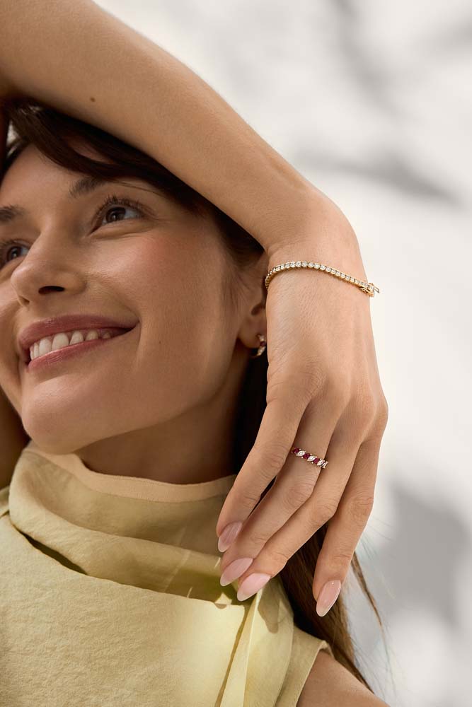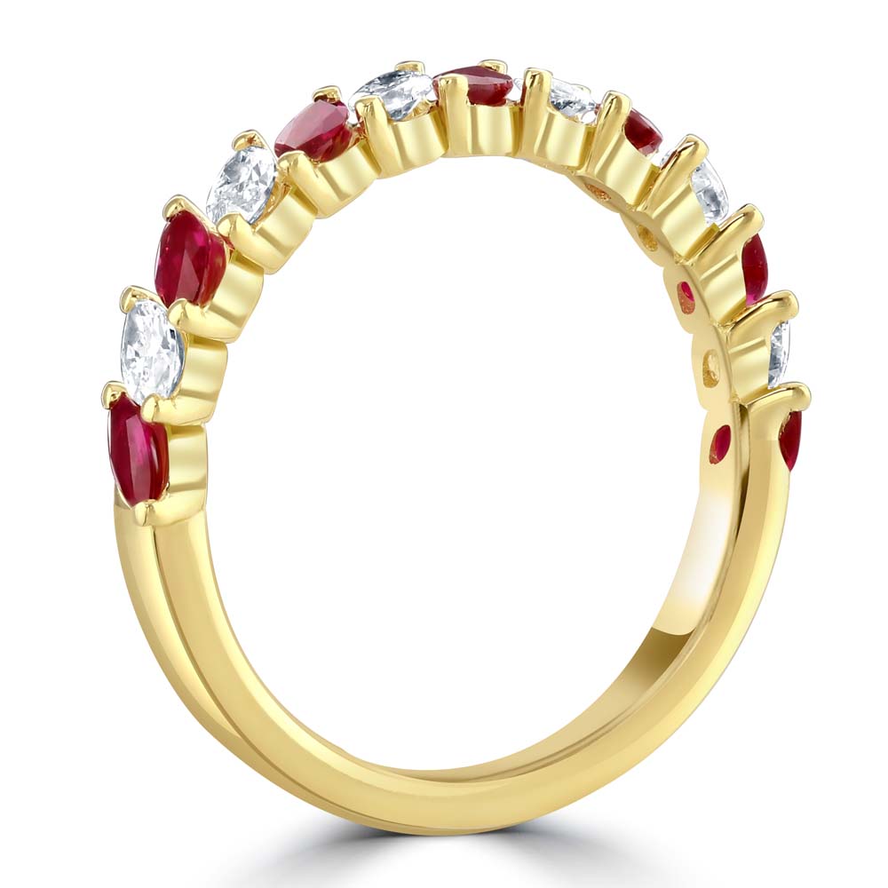 Discover the timeless elegance of our 18ct yellow gold half eternity ring, a luxurious piece that combines classic sophistication with exquisite design. This stunning ring features alternating marquise-cut rubies and diamonds, claw-set to showcase their unique shapes and brilliant hues. Seven marquise-cut rubies, totalling 0.60 carats, radiate a vibrant red, symbolizing passion and love. Complementing them are six marquise-cut diamonds, totalling 0.43 carats, which add a touch of dazzling brilliance to the piece. Crafted in lustrous 18ct yellow gold, this half eternity ring is perfect for those who appreciate elegant, timeless jewellery with a modern twist. Ideal for an anniversary gift, wedding band, or a sophisticated addition to any jewellery collection, this ring promises to be a beloved piece for years to come.