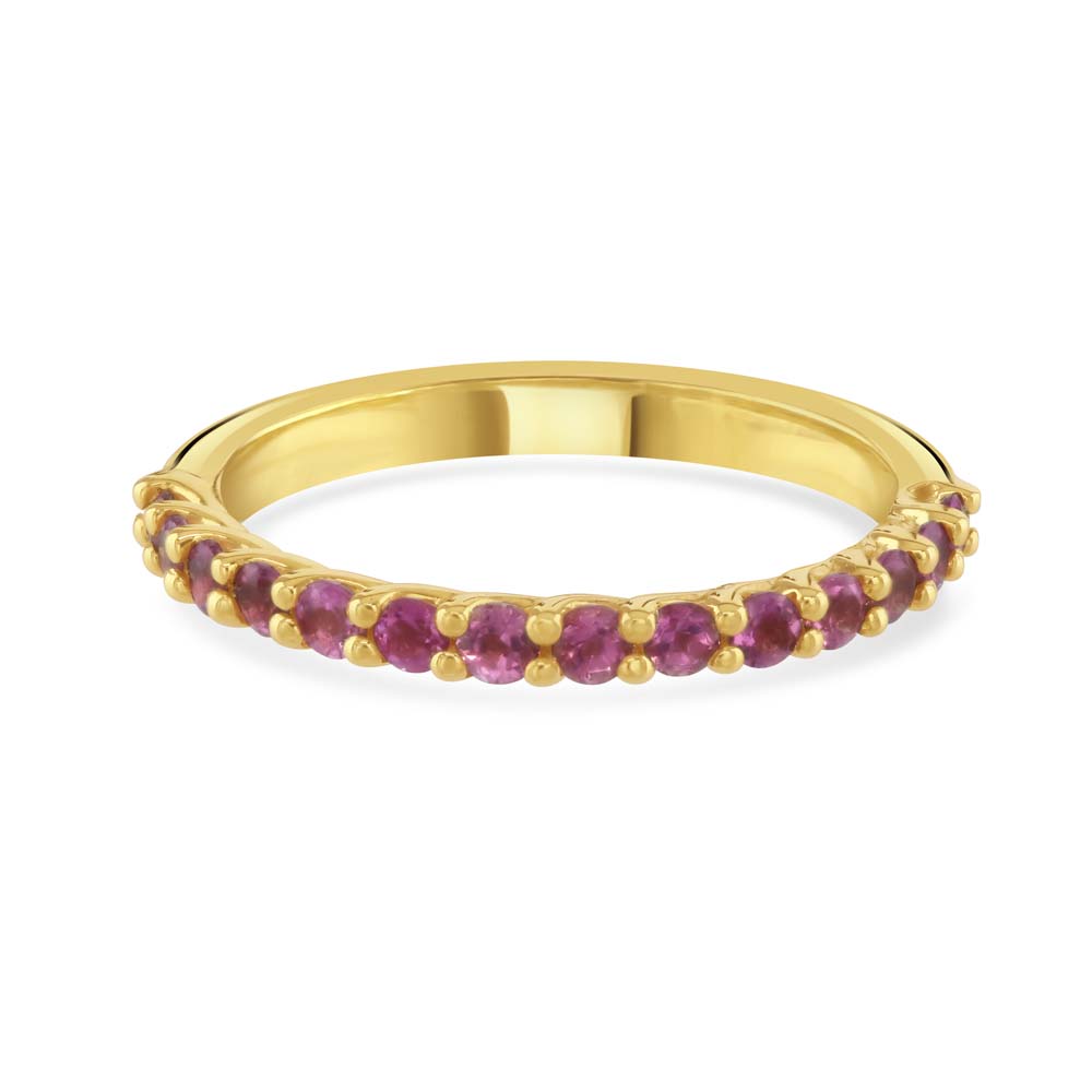 Our captivating 18ct yellow gold half eternity ring, beautifully set with 14 claw-set round pink tourmalines. This exquisite ring features a total pink tourmaline weight of 0.49ct, each stone radiating a vibrant pink hue that adds a touch of colour and elegance to your hand.