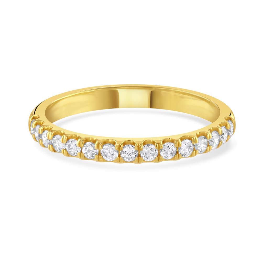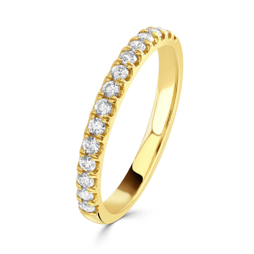 Set on a softened court band, this half eternity ring provides both comfort and style, making it an ideal choice for everyday wear or special occasions. The refined yellow gold complements the bright diamonds, offering a warm, classic look that never goes out of style.