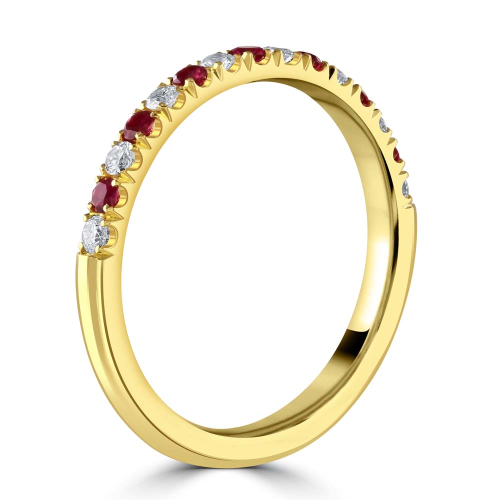 Discover the exquisite beauty of our 18ct yellow gold half eternity ring, featuring a captivating design of alternating gemstones. This luxurious ring showcases seven round rubies and eight round brilliant cut diamonds, each securely claw set to maximize their brilliance and sparkle. With a total ruby weight of 0.14 carats and a total diamond weight of 0.14 carats, this ring offers a harmonious blend of vibrant colour and dazzling light. Perfect for celebrating special occasions or adding a touch of sophistication to your jewellery collection, this 18ct yellow gold half eternity ring combines timeless elegance with exceptional craftsmanship. The rich yellow gold band beautifully complements the vivid red rubies and the radiant diamonds, creating a piece that symbolizes enduring love and elegance.