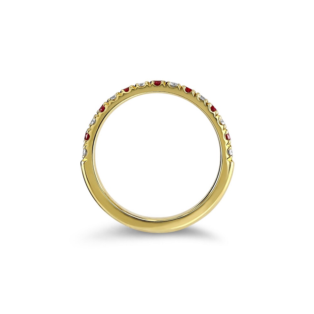 A classic 18ct yellow gold fifteen-gemstone eternity ring, artfully designed with alternating round rubies and round brilliant cut diamonds. This exquisite ring features seven rubies, each securely claw-set, totalling 0.21 carats, and eight similarly set diamonds totalling 0.20 carats. The alternating pattern of the vibrant rubies and shimmering diamonds creates a dynamic and visually captivating look. Perfect for anniversaries, special occasions, or as a daily symbol of enduring love, this ring is a timeless addition to any fine jewellery collection, offering a classic charm with a touch of luxurious sparkle.