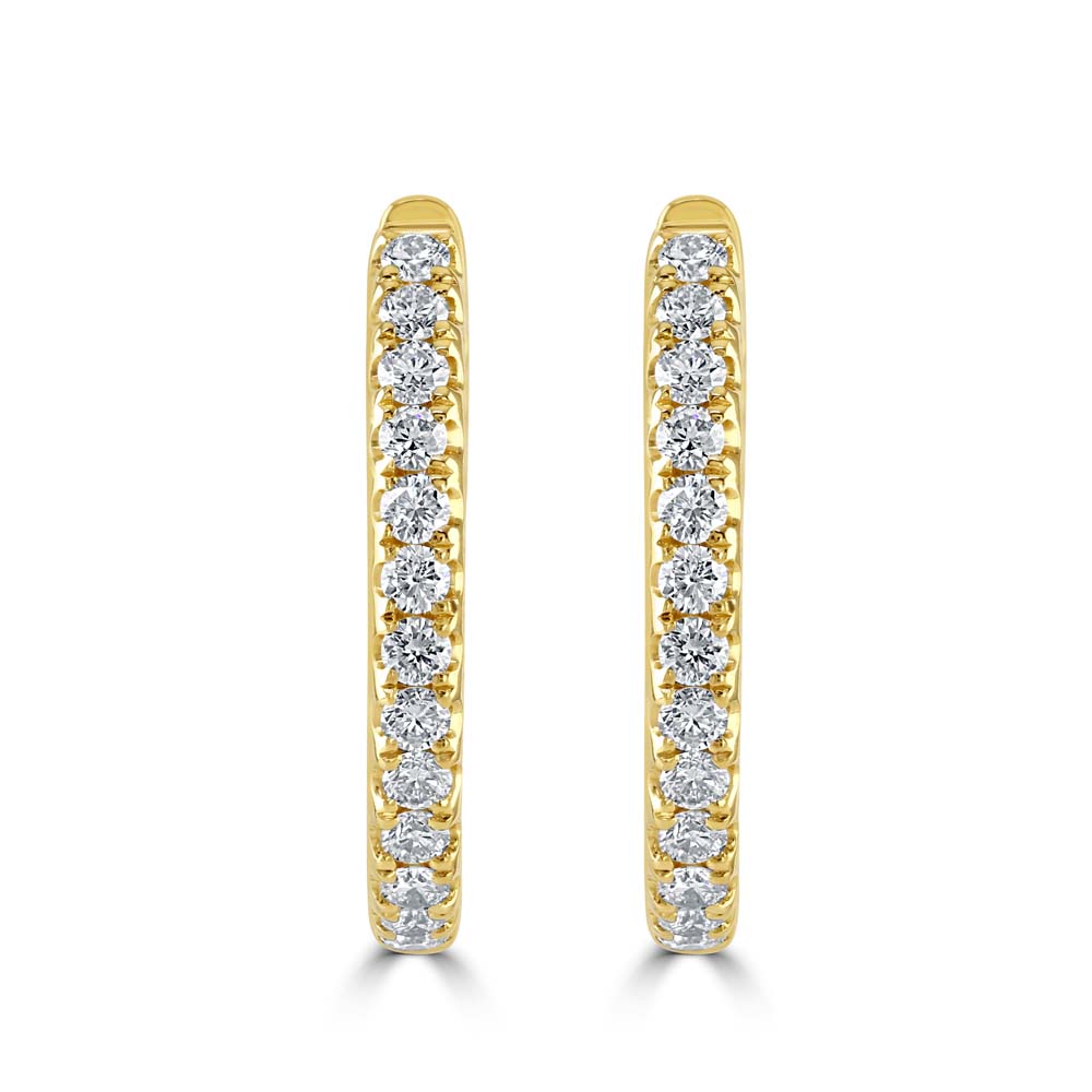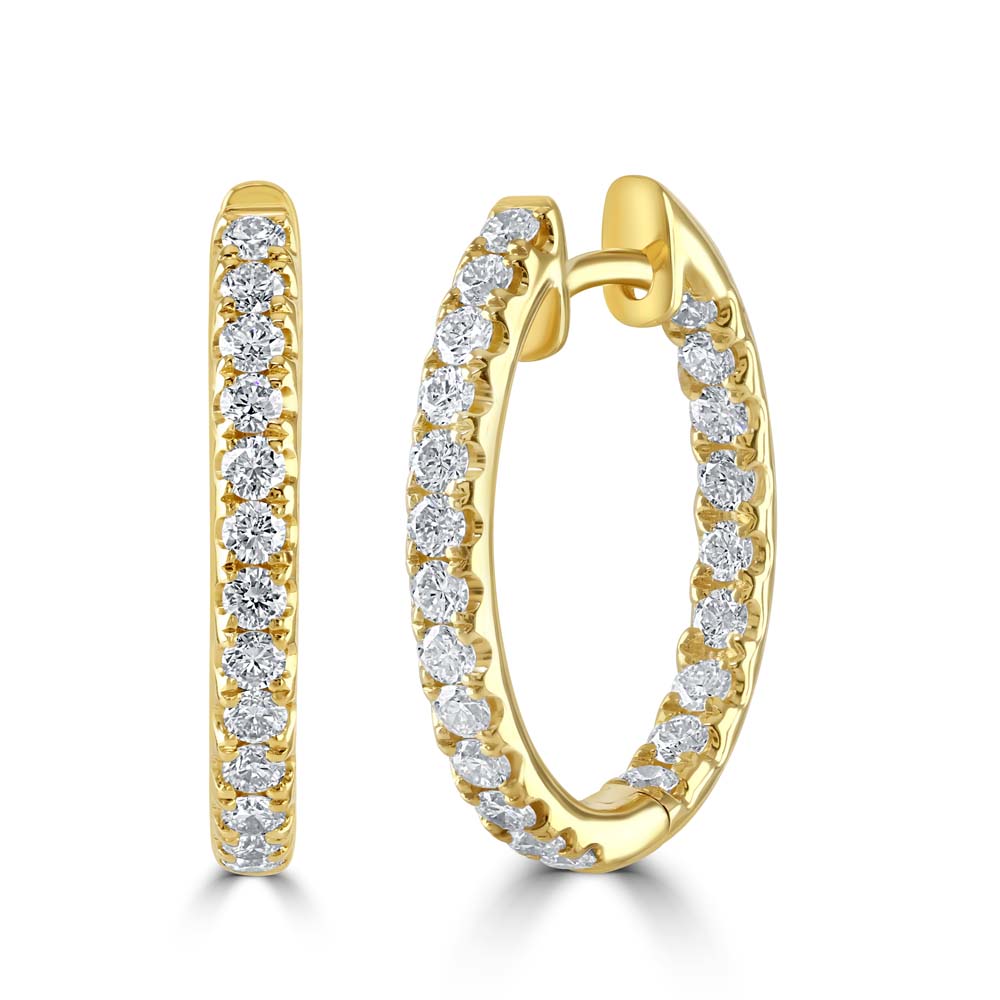 Elevate your style with these stunning 18ct yellow gold hinged oval hoop earrings, designed to sparkle from every angle. Featuring 13 round brilliant-cut diamonds down the front and 9 diamonds on the inside back, these inside-out hoops deliver exceptional brilliance and elegance. With a total diamond weight of 0.97ct, they are the perfect blend of luxury and versatility. Ideal for day-to-night wear, these earrings combine timeless design with modern sophistication—an essential addition to any fine jewellery collection.