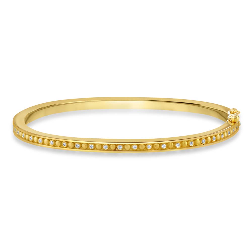 This exquisite 18ct yellow gold bangle boasts a unique oval shape and a hinged design for ease of wear. It features an elegant pattern of 26 round brilliant cut diamonds, each carefully rubover set to showcase their brilliance. These diamonds alternate with delicate beads of yellow gold, creating a harmonious balance of sparkle and shine. The bangle is secured with a figure of eight safety clasp, providing both security and a seamless finish. This blend of radiant diamonds and polished gold beads set against the backdrop of the yellow gold bangle makes it a sophisticated and stylish piece, perfect for adding a touch of luxury to any outfit."
