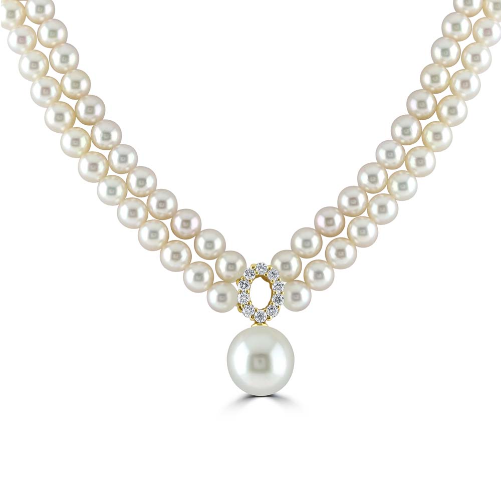 An exquisite necklace, featuring two rows of lustrous Akoya cultured pearls, seamlessly joined by a captivating diamond-set open oval. This centrepiece is elegantly designed to draw the eye, sparkling with meticulously placed diamonds that exude luxury and sophistication. Dangling gracefully from this opulent oval is a single, magnificent South Sea pearl, renowned for its impressive size and radiant sheen, adding a touch of understated elegance to this stunning piece. The necklace is brought together with an 18ct yellow gold double clasp, ensuring both security and ease of wear. This clasp not only serves a practical purpose but also adds an extra element of design, complementing the warm tones of the South Sea pearl and the Akoya pearls' soft lustre.