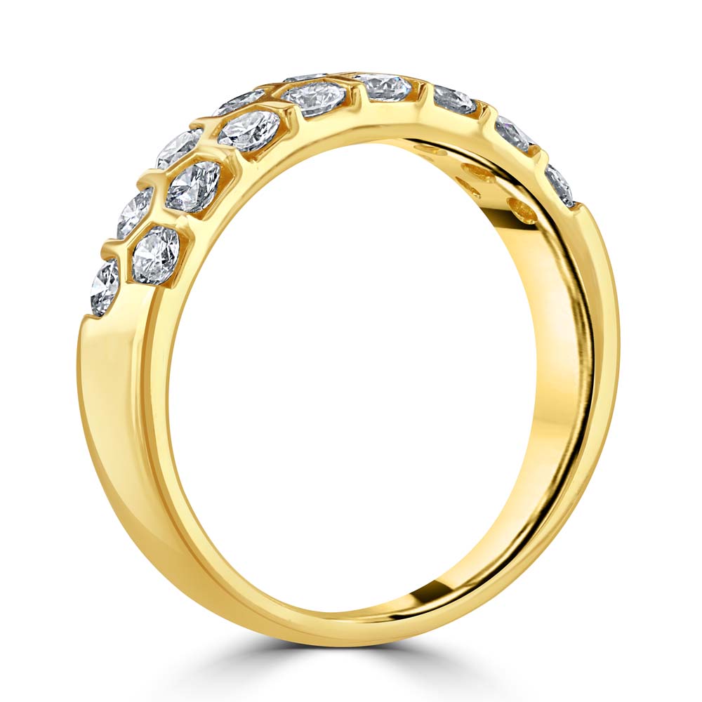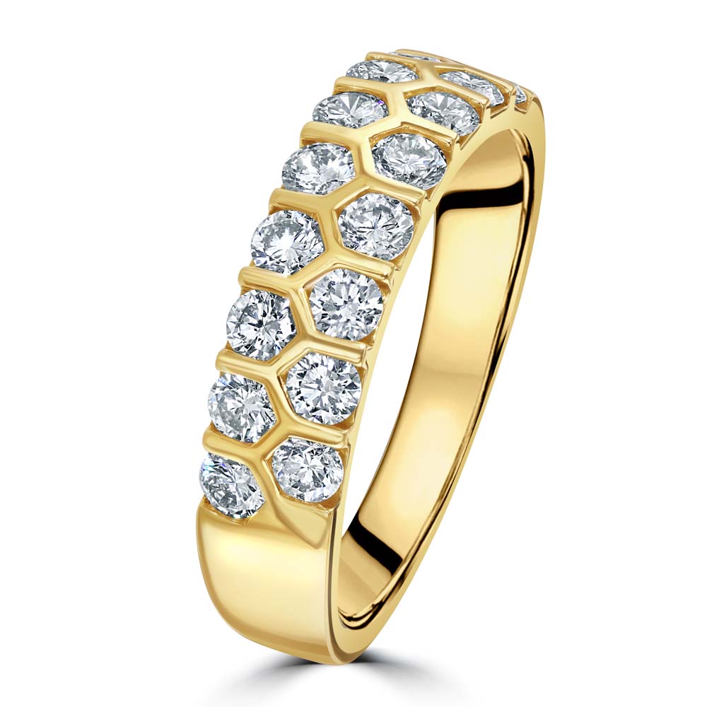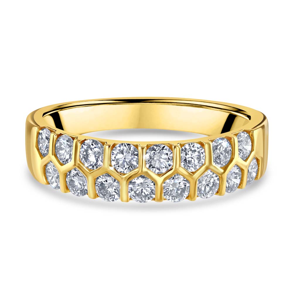 Introducing our exquisite 18ct yellow gold honeycomb design ring, a stunning tribute to contemporary design and classic elegance. This beautifully crafted ring features an enchanting 2 rows of honeycomb-inspired set round brilliant cut diamonds. With a total diamond weight of 1.01ct, each diamond is selected for its superior sparkle and brilliance. The warm hue of the yellow gold complements the bright fire of the diamonds, creating a captivating contrast that's both modern and timeless. This unique honeycomb design seamlessly blends the allure of natural forms with the luxury of fine jewellery, making it a perfect choice for those who seek a distinctive and stylish piece that stands out from the crowd.