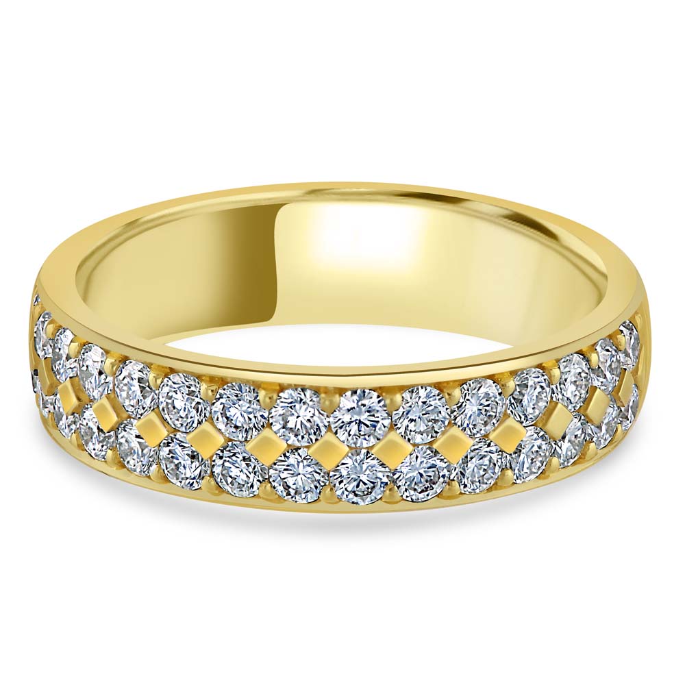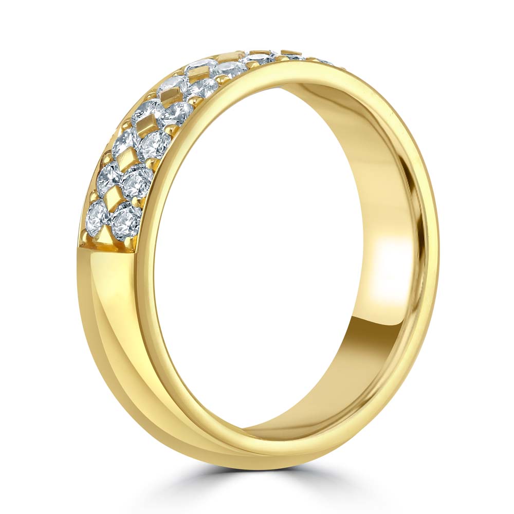 Enhance your jewellery collection with our exquisite 18ct yellow gold ring, featuring two rows of meticulously pavé-set round brilliant cut diamonds. This stunning piece boasts a total diamond weight of 0.85 carats, offering a continuous sparkle that wraps around the band for a luxurious and eye-catching effect. Crafted from high-quality 18ct yellow gold, this ring exudes warmth and elegance, making it a perfect choice for those seeking a touch of glamour. Ideal for special events or as a sophisticated addition to your daily ensemble, this pavé diamond ring combines timeless design with contemporary appeal, ensuring it remains a favourite for years to come.