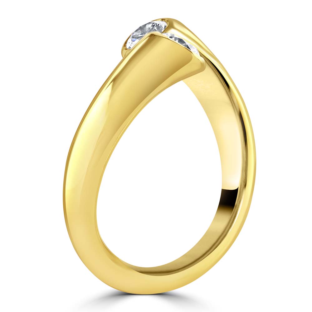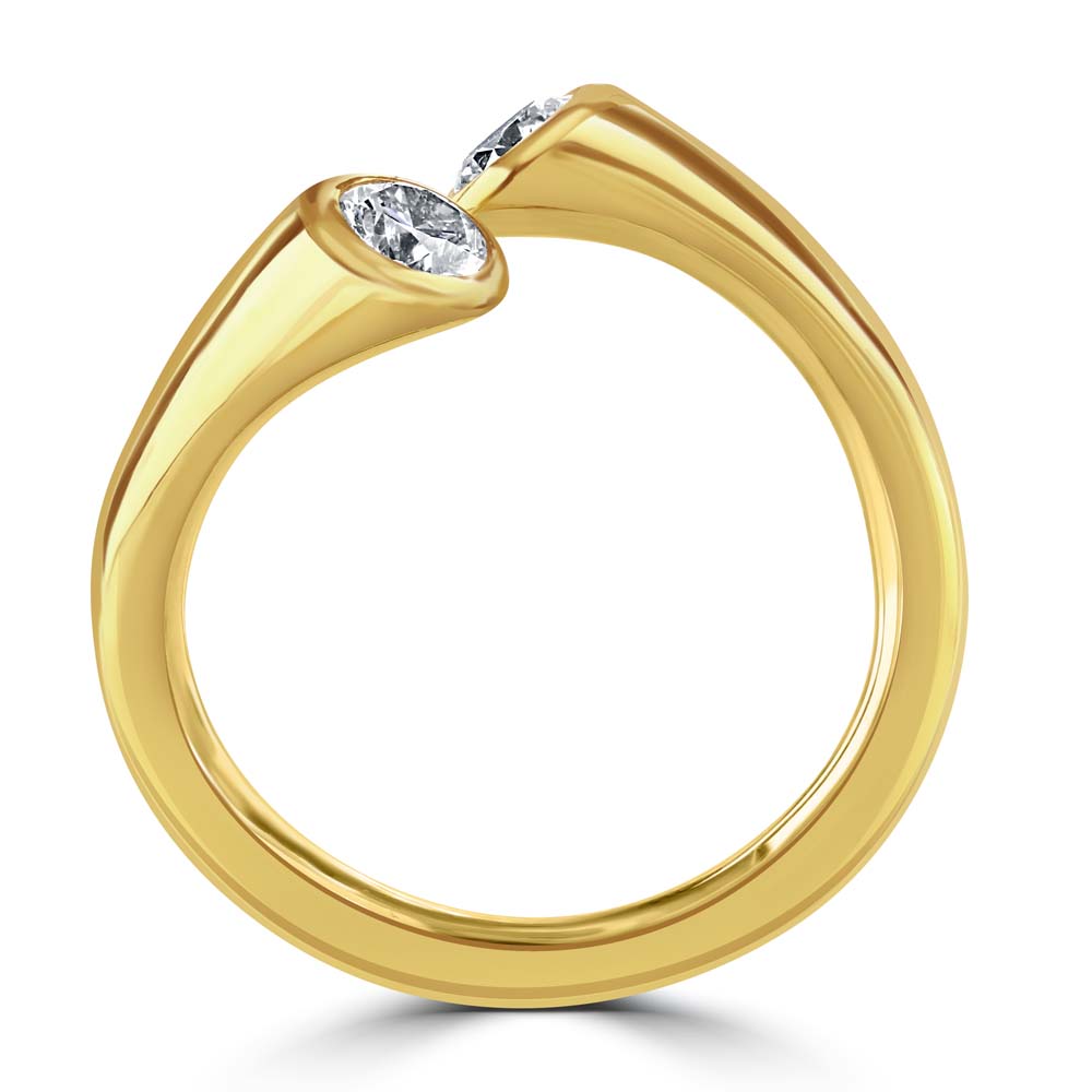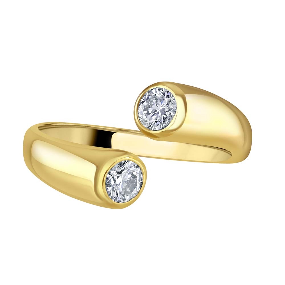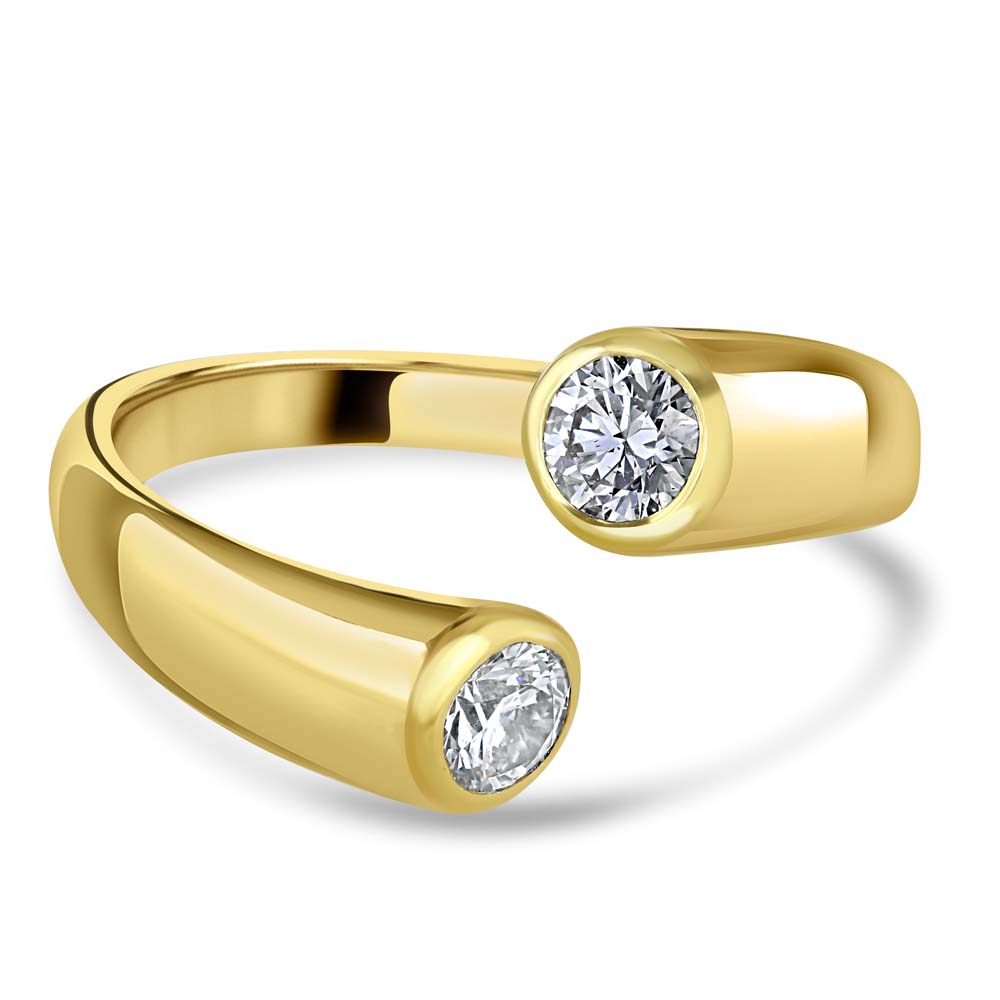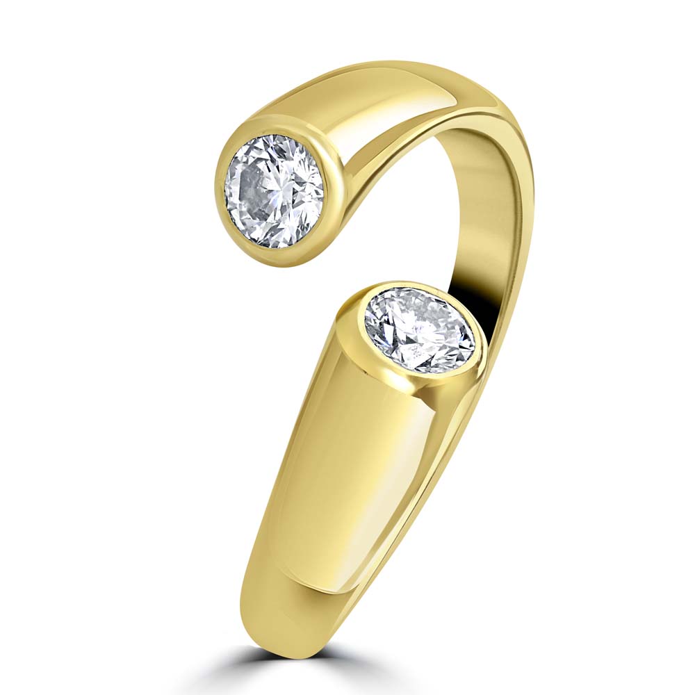 Introducing our exquisite18ct yellow gold ring, elegantly designed with two rubover set round brilliant cut diamonds. This unique and sophisticated ring features a captivating crossover design that symbolizes the union of two souls, making it a perfect choice for engagements, anniversaries, or special occasions. The centrepiece of this stunning ring showcases two round brilliant cut diamonds, expertly set in a secure rubover setting. With a total diamond weight of 0.61 carats, these diamonds radiate exceptional brilliance and fire, capturing the light from every angle. The 18ct yellow gold band provides a warm and luxurious contrast, enhancing the overall beauty and elegance of the ring. Crafted with precision and attention to detail, this beautiful ring combines timeless design with modern sophistication. The crossover trumpet design not only adds a unique touch but also ensures a comfortable fit for everyday wear or special occasions. Perfect for expressing your love and commitment, this 18ct yellow gold crossover ring is a symbol of enduring love and refined elegance.