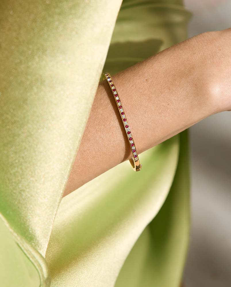 A luxurious 18ct yellow gold oval hinged bangle, a true masterpiece of fine jewellery design. This exquisite bangle is meticulously grain set with 17 vibrant round rubies and 17 dazzling round brilliant-cut diamonds, alternating in a harmonious sequence that captures the light with every movement. The rubies, totalling 0.51 carats, exude a rich, captivating red, while the diamonds, weighing a total of 0.34 carats, sparkle with clarity and brilliance. Crafted with a secure hinged closure for easy wear, this bangle is perfect for elevating evening wear or adding a touch of opulence to your everyday attire. Embrace elegance with this stunning piece, which combines classic style with modern luxury.