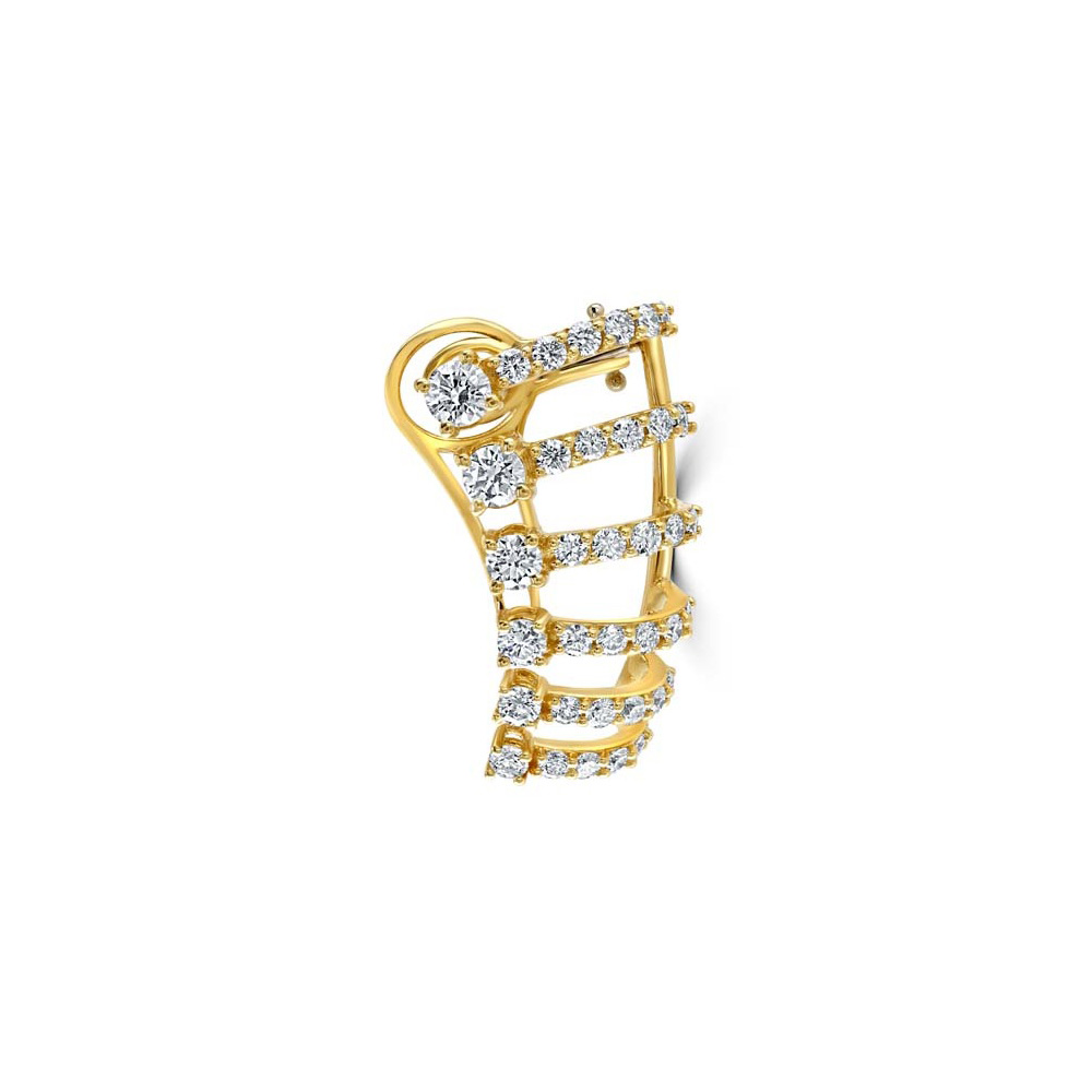 Make a bold statement with this luxurious 18ct yellow gold single ear cuff, designed with six graduated rows of claw-set round brilliant-cut diamonds for a striking, layered effect. Featuring 37 diamonds in total, this piece offers exceptional sparkle and modern elegance. With a total diamond weight of 1.09ct, graded G colour / SI clarity, and secured with a post and clip fitting, it combines comfort with high-end craftsmanship. Perfect for those who love contemporary luxury, this ear cuff adds instant glamour and individuality to any lookâideal for special occasions or as a standout everyday piece.
