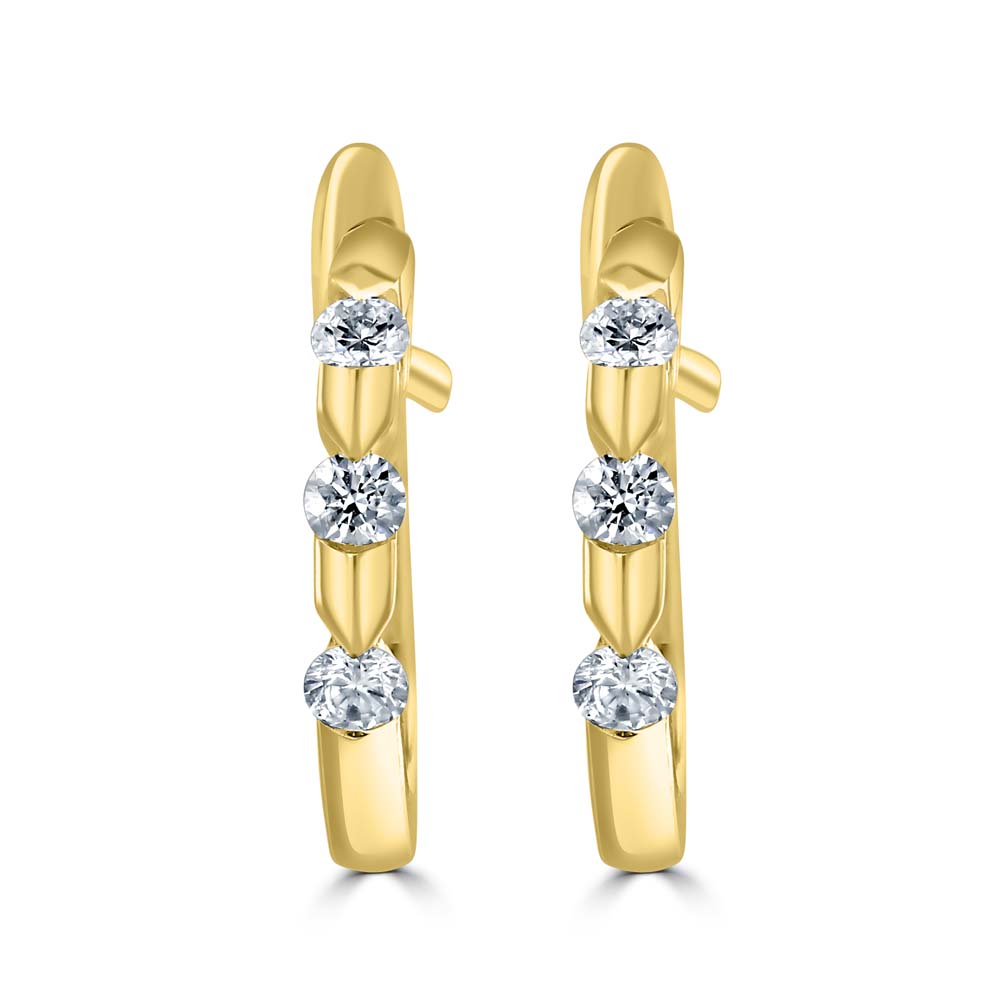 A beautiful pair of 18ct yellow gold hinged hoop earrings, each adorned with three round brilliant cut diamonds, set to perfection. These exquisite earrings boast a total diamond weight of 0.18 carats, offering just the right amount of sparkle to catch the eye without overwhelming. Crafted from premium 18ct yellow gold, these hoop earrings feature a sleek and modern design that hinges open for easy wear, ensuring both security and comfort. The bar setting not only secures the diamonds safely but also allows for maximum exposure of each gem, enhancing their brilliance and sparkle with every turn of the head. Ideal for both day-to-day elegance and special occasions, these earrings seamlessly blend classic charm with contemporary style. Their understated design makes them a versatile addition to any jewellery collection, suitable for enhancing both casual and formal ensembles.