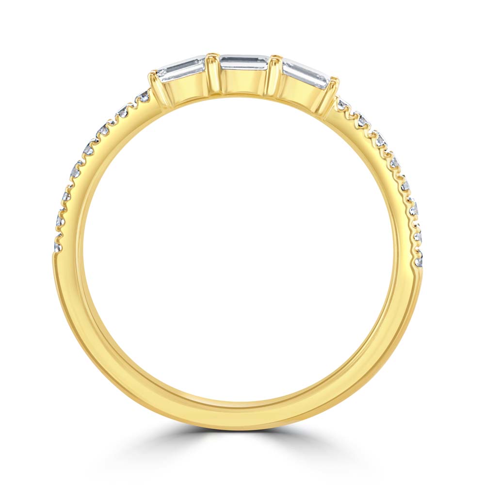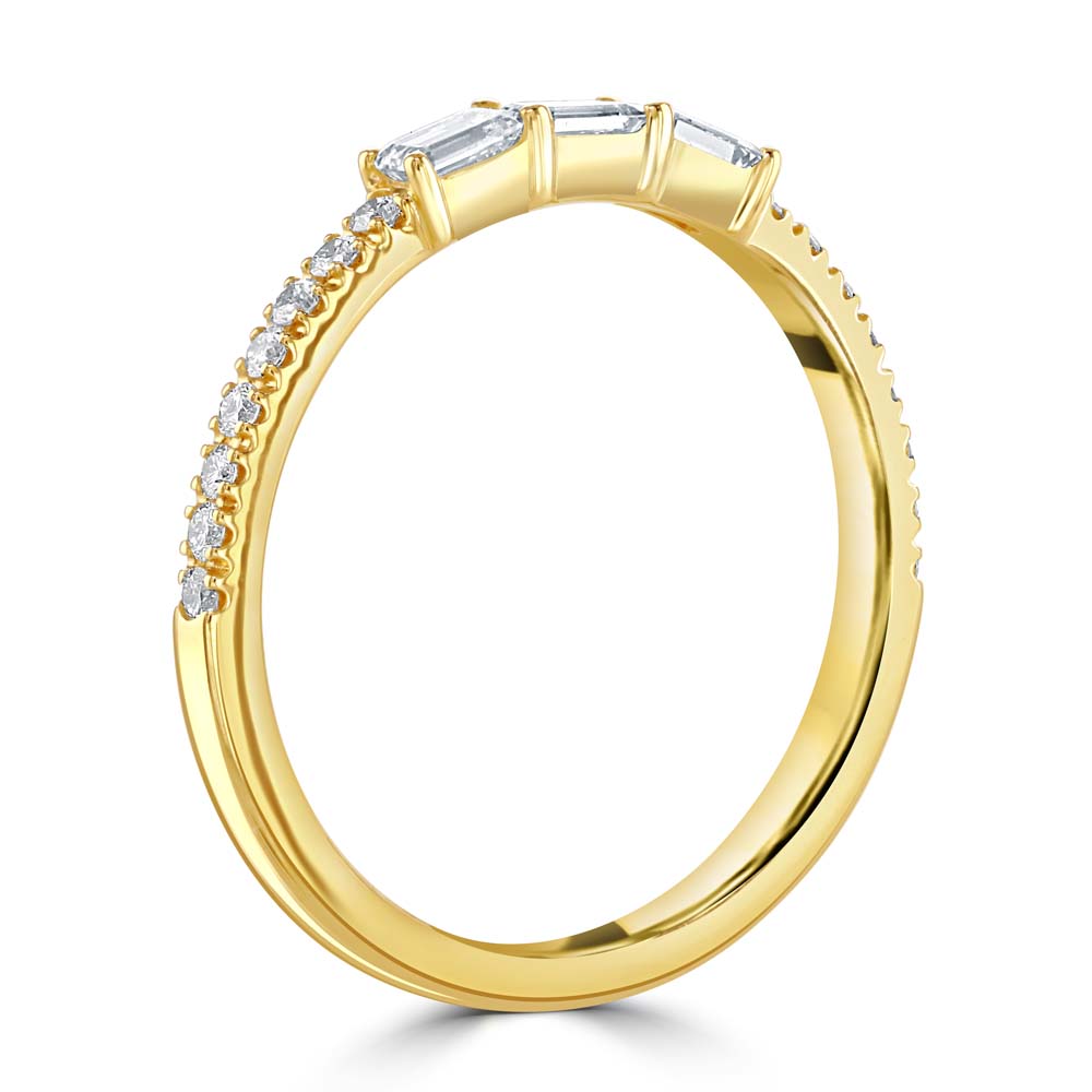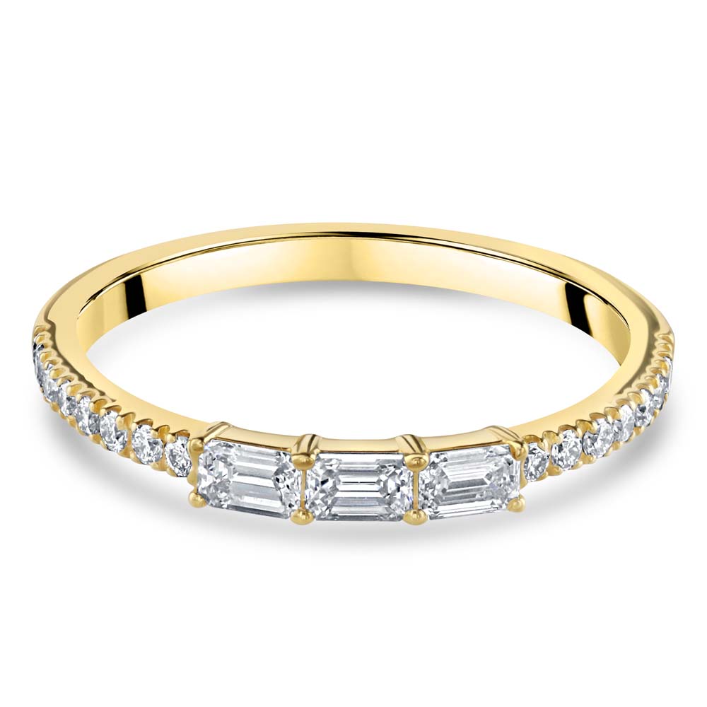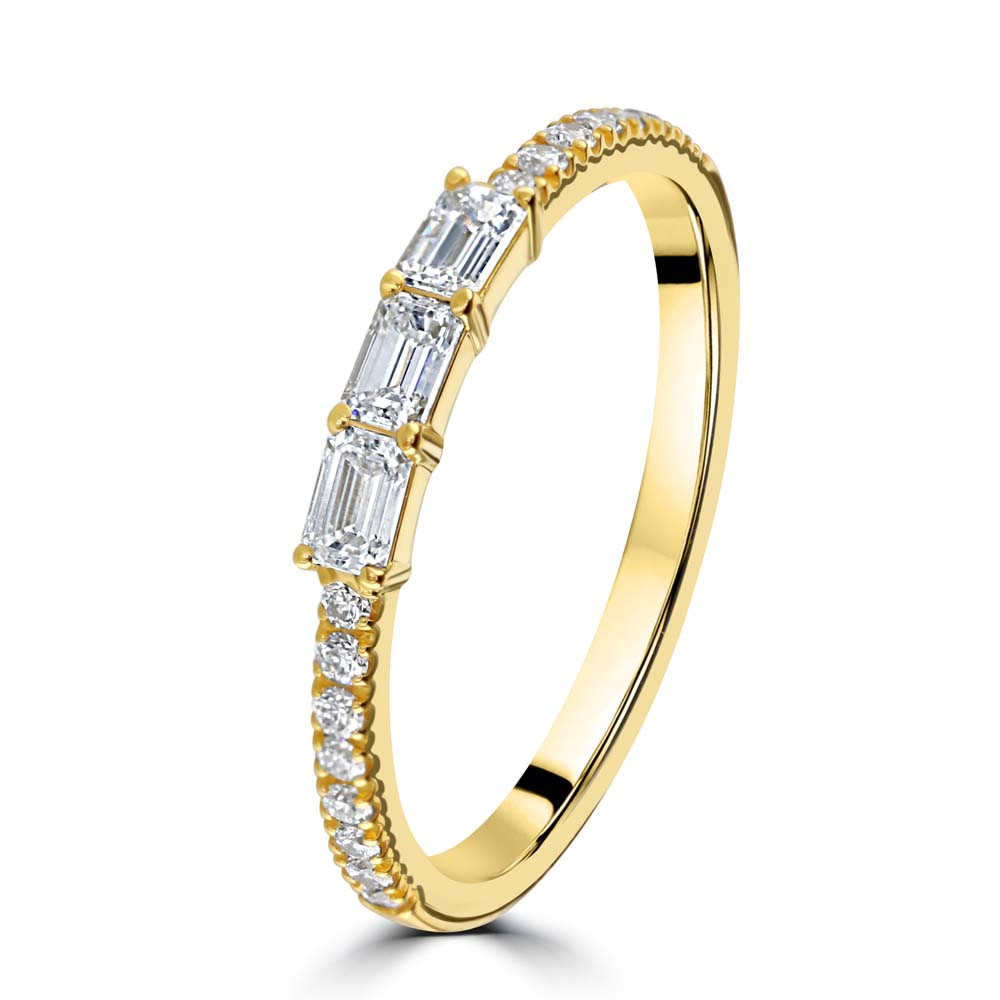 A timeless 18ct yellow gold ring, featuring three stunning claw-set emerald cut diamonds at its centre. These exquisite diamonds, with a total weight of 0.28ct and G colour/VS clarity, radiate exceptional brilliance and sophistication. Enhancing the central stones are eight round brilliant cut diamonds set along the shoulders, adding extra sparkle and elegance to the design. The combination of emerald and round cut diamonds creates a harmonious and luxurious look, making this ring a perfect symbol of enduring love and commitment. Ideal for engagements, anniversaries, or special occasions, this trilogy ring is designed to be cherished for a lifetime. Its superior craftsmanship and elegant style ensure it will be a treasured addition to any jewellery collection.
