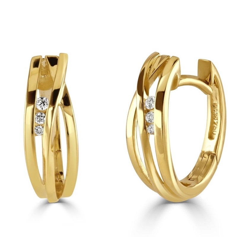Introducing our sophisticated 18ct yellow gold hinged hoop earrings, featuring an elegant design with three overlapping plain strands interlaced with three graduated round brilliant cut diamonds. These diamonds, channel-set to perfection, boast a total weight of 0.05ct, offering just the right amount of sparkle to illuminate your look. The hinged design ensures easy wearability and a secure fit, making these earrings both functional and fashionable. Perfect for adding a modern twist to any outfit, these earrings are a must-have for anyone seeking a blend of classic elegance and contemporary style. Elevate your jewellery collection with these exquisite yellow gold and diamond hoop earrings, designed to dazzle at every occasion.