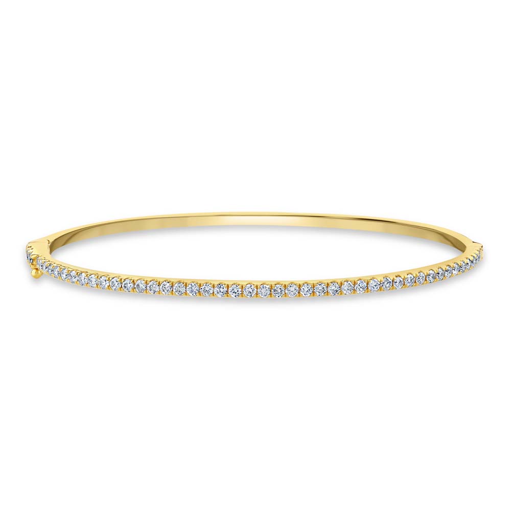 This elegant bangle is masterfully crafted from 18ct yellow gold and is adorned with a dazzling array of diamonds. It features 46 round brilliant cut diamonds, each expertly set to maximize their sparkle and brilliance. These diamonds encircle the bangle, creating a continuous band of light that adds a luxurious touch to the piece. The bangle is secured with a figure 8 safety clasp, ensuring both comfort and security while wearing. The combination of the warm yellow gold and the radiant diamonds makes this bangle a sophisticated and timeless piece of jewellery, perfect for adding a touch of glamour to any ensemble.