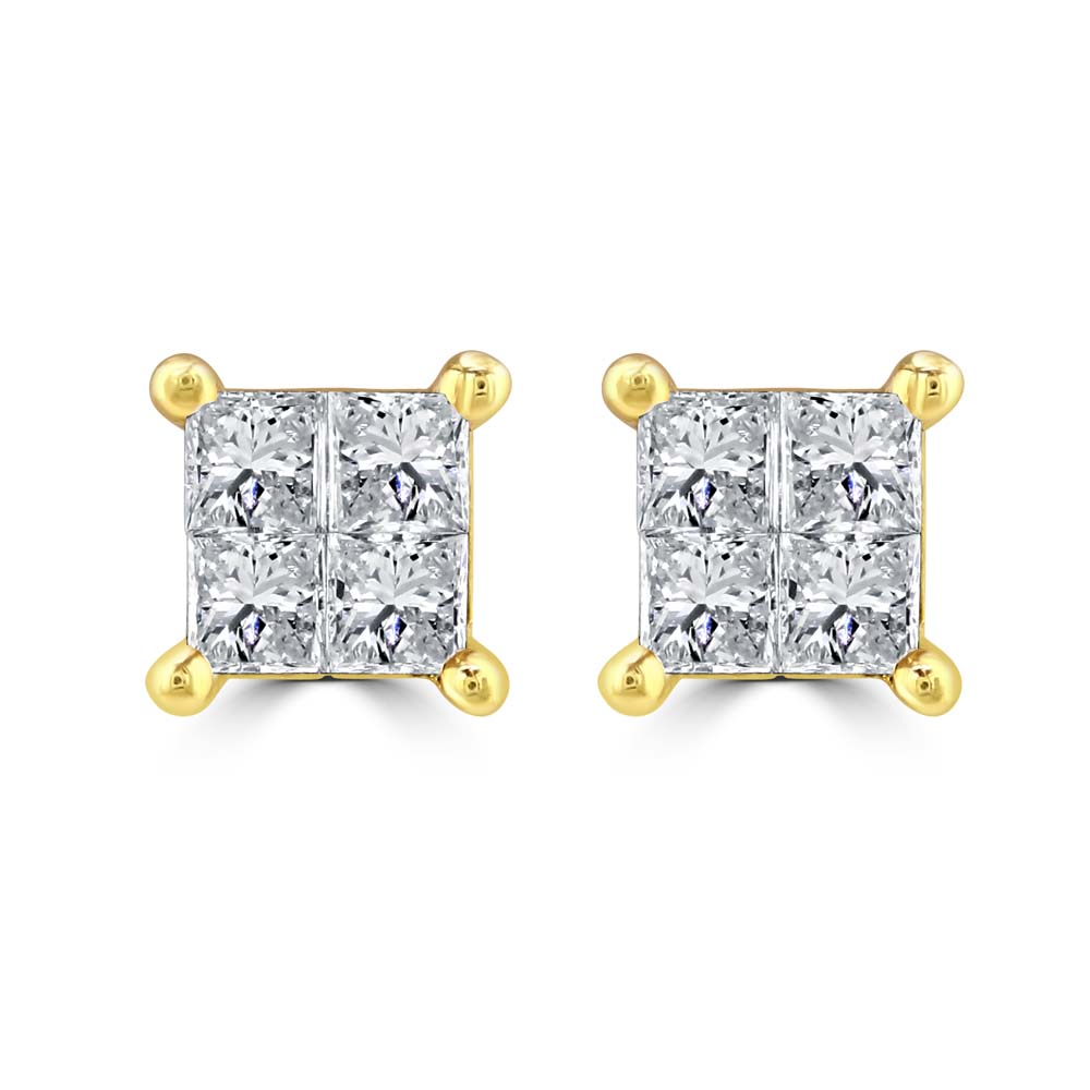 Enhance your elegance with our 18ct yellow gold stud earrings, each meticulously set with four princess cut diamonds in a secure four-claw setting. These exquisite earrings, featuring a total diamond weight of 0.75ct, radiate sophistication and brilliance. The post and butterfly fittings ensure comfort and a secure fit for pierced ears. Perfect for any occasion, these yellow gold diamond stud earrings are a timeless addition to your jewellery collection, offering a luxurious touch to your everyday style.