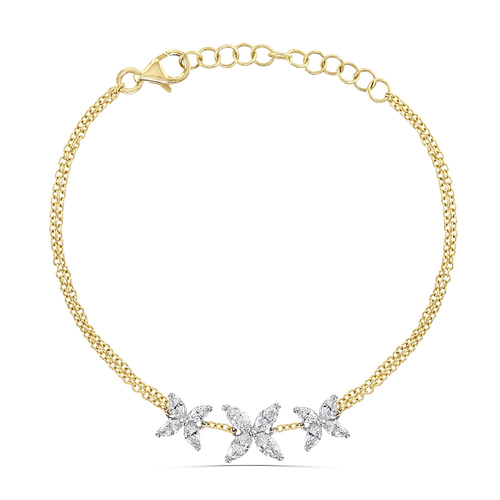 Introducing our stunning 18ct gold bracelet, a unique fusion of elegance and artistry. This luxurious bracelet features two strands of delicate 18ct yellow gold trace chain, providing a graceful and refined appearance. At the heart of this exquisite piece are three flower-shaped accents, each meticulously crafted from 18ct white gold. The floral designs are beautifully highlighted with four marquise diamonds set as petals in each flower, totalling a diamond weight of 1.06 carats. These sparkling diamonds add a touch of glamour and sophistication, making this bracelet a perfect choice for those who appreciate intricate designs combined with luxurious materials. Ideal for special occasions or as an elegant gift, this bracelet is sure to enchant and captivate.