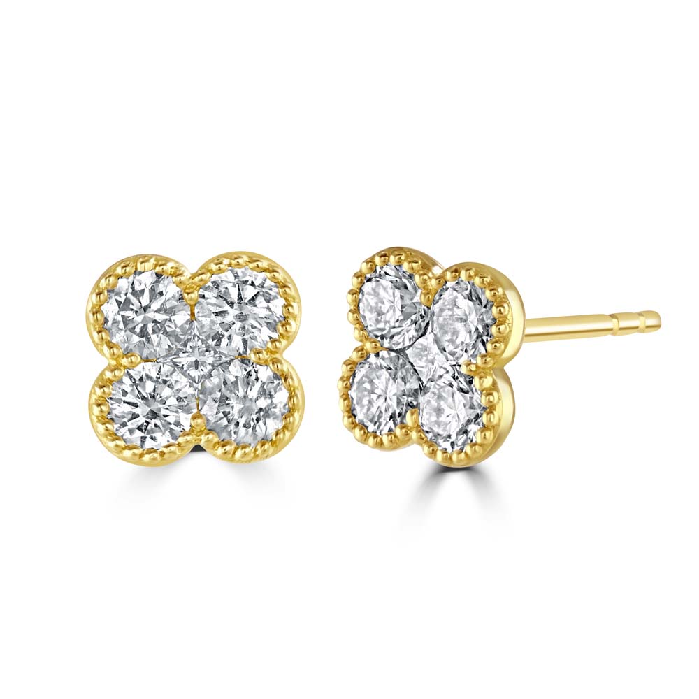 These gorgeous 18ct yellow gold, showcasing a timeless quatrefoil design with a touch of modern refinement. Each earring is adorned with four round brilliant cut diamonds, arranged to form the elegant quatrefoil shape, known for its classic, symmetrical appearance. At the center of each earring sits a princess cut diamond, chosen for its unique square shape and exceptional light-reflecting properties, serving as a captivating focal point. The edges of the earrings are intricately detailed with milgrain edging, providing a delicate, vintage-inspired finish that complements the overall design. These earrings are equipped with post and butterfly fittings, ensuring a secure and comfortable wear.
