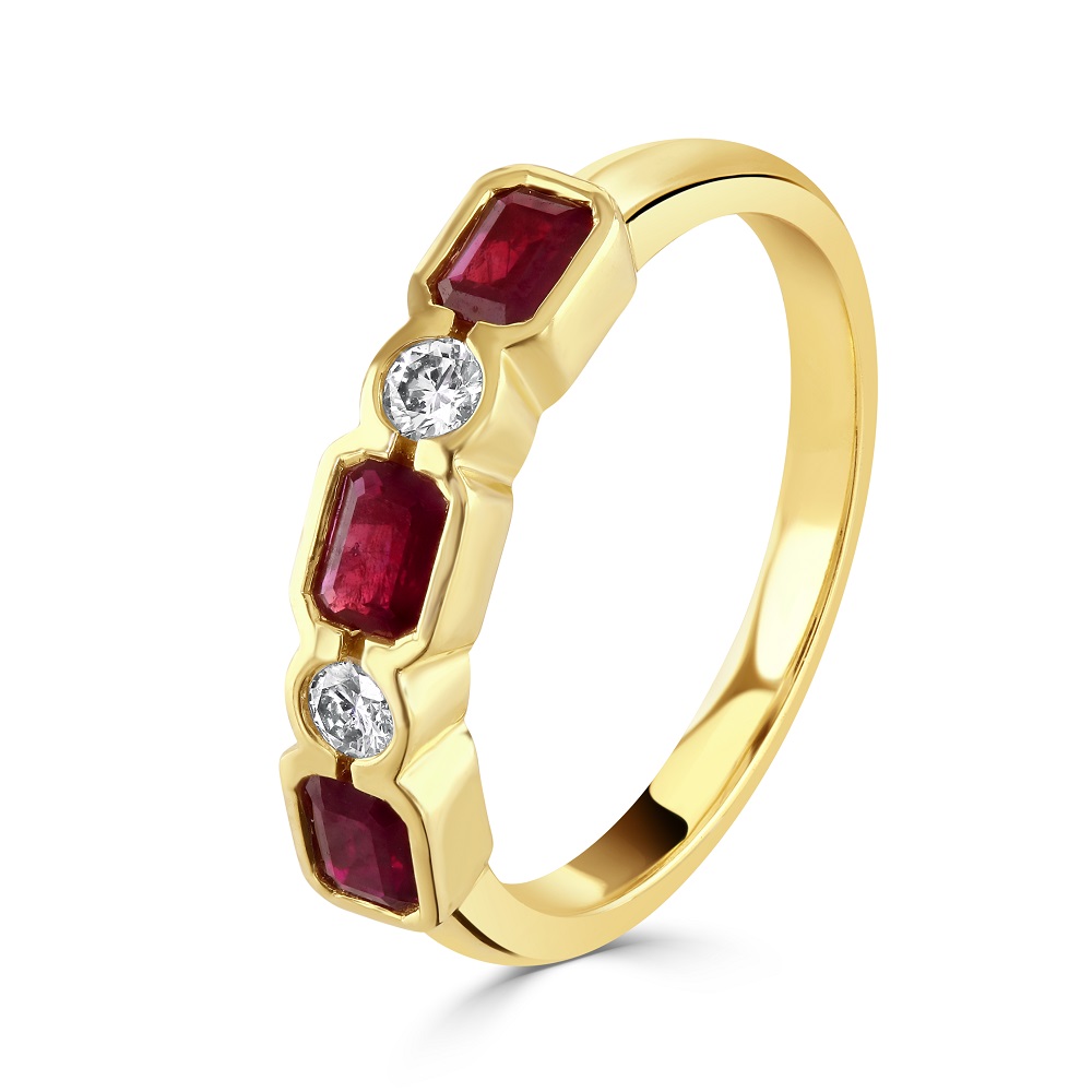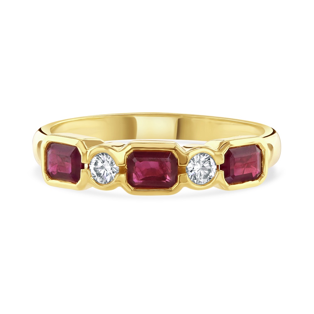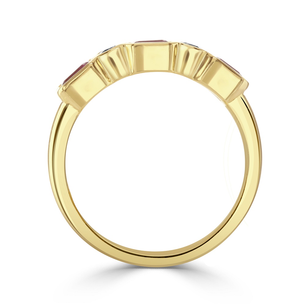 A graceful blend of bold colour and timeless design, this five-stone ring is crafted in rich 18ct yellow gold and features a striking arrangement of three octagon cut rubies alternating with two round brilliant cut diamonds. Each gemstone is rubover set, offering a sleek, contemporary finish that enhances both comfort and durability. With a total ruby weight of 0.79ct and diamond weight of 0.12ct, this ring presents a harmonious balance of vibrant red and sparkling white. The geometric elegance of the octagon cut rubies adds a distinctive touch, while the diamonds bring refined brilliance to the design. Perfect for marking a special occasion or adding a touch of luxury to everyday wear, this ring is a celebration of colour, craftsmanship, and enduring style.