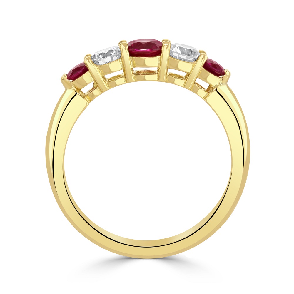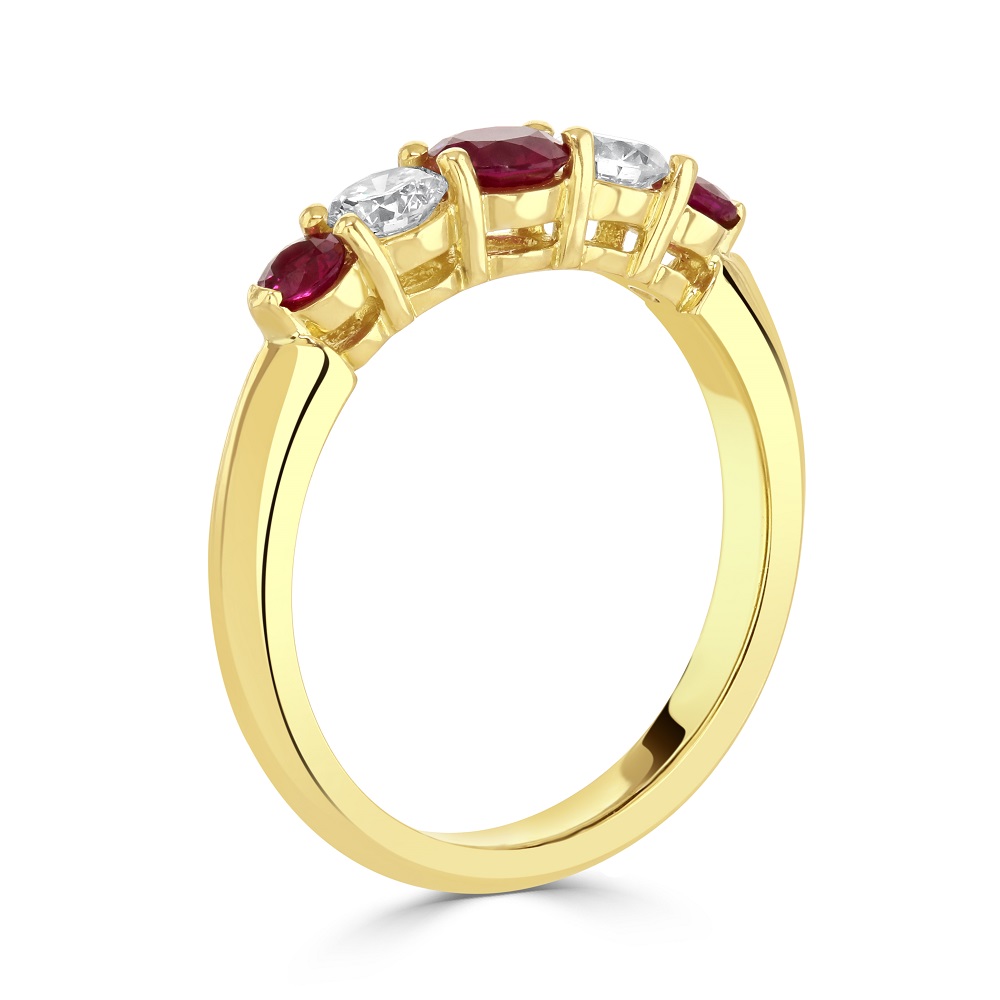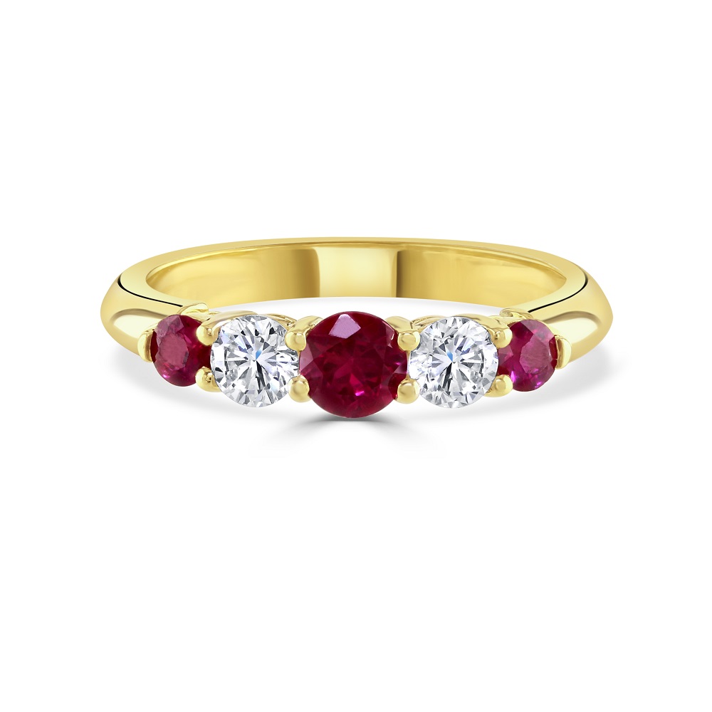 An exquisite 18ct yellow gold five gemstone ring, featuring a captivating arrangement of alternating and graduated gemstones. This ring showcases three claw-set, round rubies, totalling 0.38 carats, each radiating a deep, enchanting red. Between these stunning rubies lie two round brilliant-cut diamonds, with a combined weight of 0.40 carats, that glitter with unmatched brilliance. The claw settings enhance the visibility of each gemstone, allowing light to illuminate their breathtaking beauty from every angle. Ideal for special occasions or as a cherished gift, this ring epitomizes luxurious sophistication and adds a touch of glamour to any ensemble