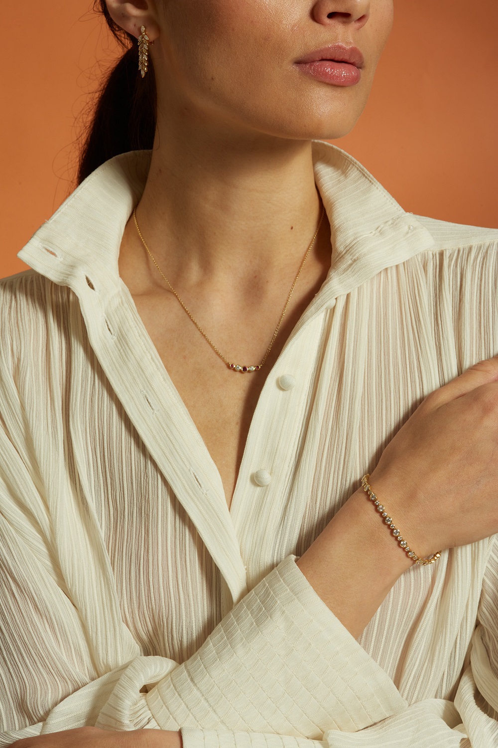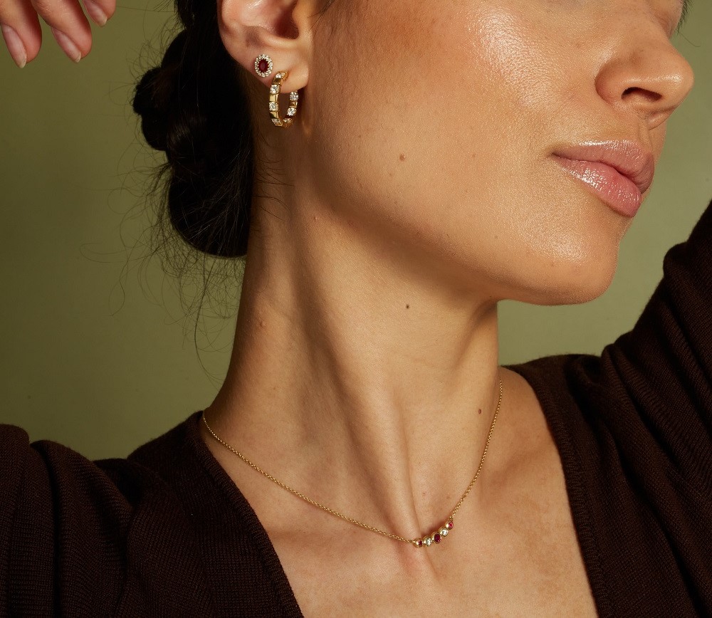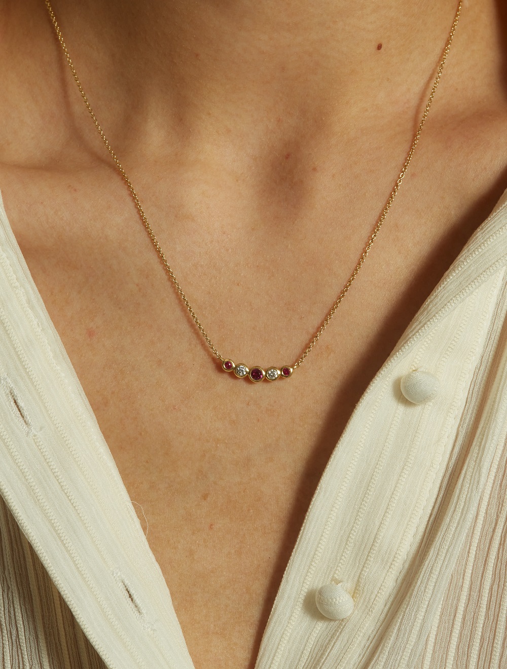 Adorn your neckline with the timeless elegance of our 18ct yellow gold garland pendant, featuring a meticulously arranged series of graduated and rubover-set gemstones. This exquisite piece includes three round rubies, with the centre ruby weighing 0.15 carats and the other two rubies totalling 0.08 carats. Complementing the vibrant rubies are two round brilliant cut diamonds, collectively weighing 0.12 carats. Each gemstone is alternately set to create a harmonious and appealing design, suspended from a delicate 18ct yellow gold trace chain. Ideal for adding a touch of sophistication to both day and evening wear, this pendant captures the essence of classic jewellery design with a modern touch.