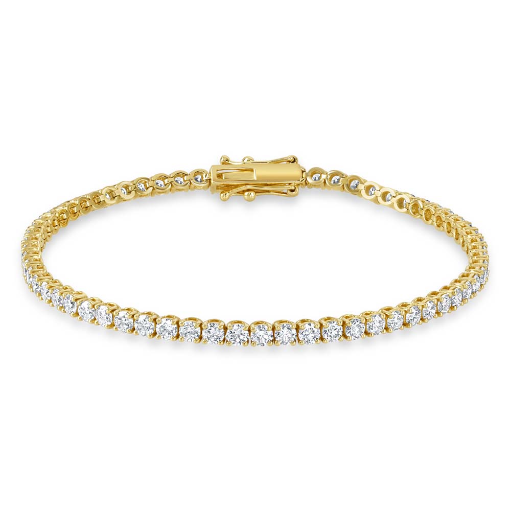 Elevate your elegance with this 18ct yellow gold line bracelet, a timeless expression of luxury and craftsmanship. Featuring 64 round brilliant-cut diamonds, each securely held in a classic four-claw setting, this piece radiates brilliance from every angle. With a total diamond weight of 4.10 carats, graded G in color and SI in clarity, it offers exceptional sparkle and sophistication. Finished with a double figure-eight safety clasp for ultimate security, this bracelet is designed to be as enduring as it is exquisite—a perfect statement for those who appreciate refined beauty.