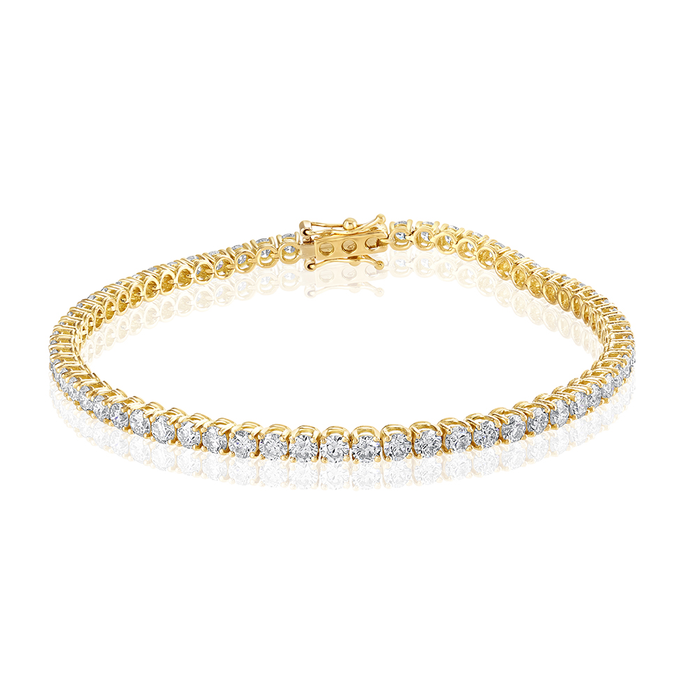 A stunning 18ct yellow gold line bracelet, a beacon of luxury and elegance. This exquisite bracelet is beautifully adorned with 64 round brilliant cut diamonds, each carefully 4 claw set to showcase their unmatched sparkle and clarity. The total diamond weight of this opulent piece is an impressive 5.34ct, making it a dazzling statement of sophistication and style. Designed with a double safety clasp for added security and peace of mind, this bracelet combines functionality with glamour. Whether for a special occasion or everyday luxury, this 18ct yellow gold diamond line bracelet is a timeless investment that epitomizes refined beauty.