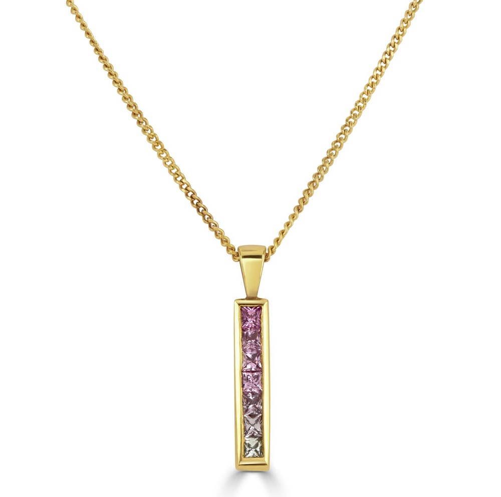 A dazzling 18ct yellow gold pendant that beautifully showcases seven square pink sapphires in a graceful gradient of colour. Each sapphire is precisely set in a secure channel setting, highlighting the vibrant hues that transition elegantly from one gem to the next. This exquisite pendant hangs from a 16-inch filed curb chain crafted in luxurious 18ct yellow gold, enhancing its rich, warm tones.