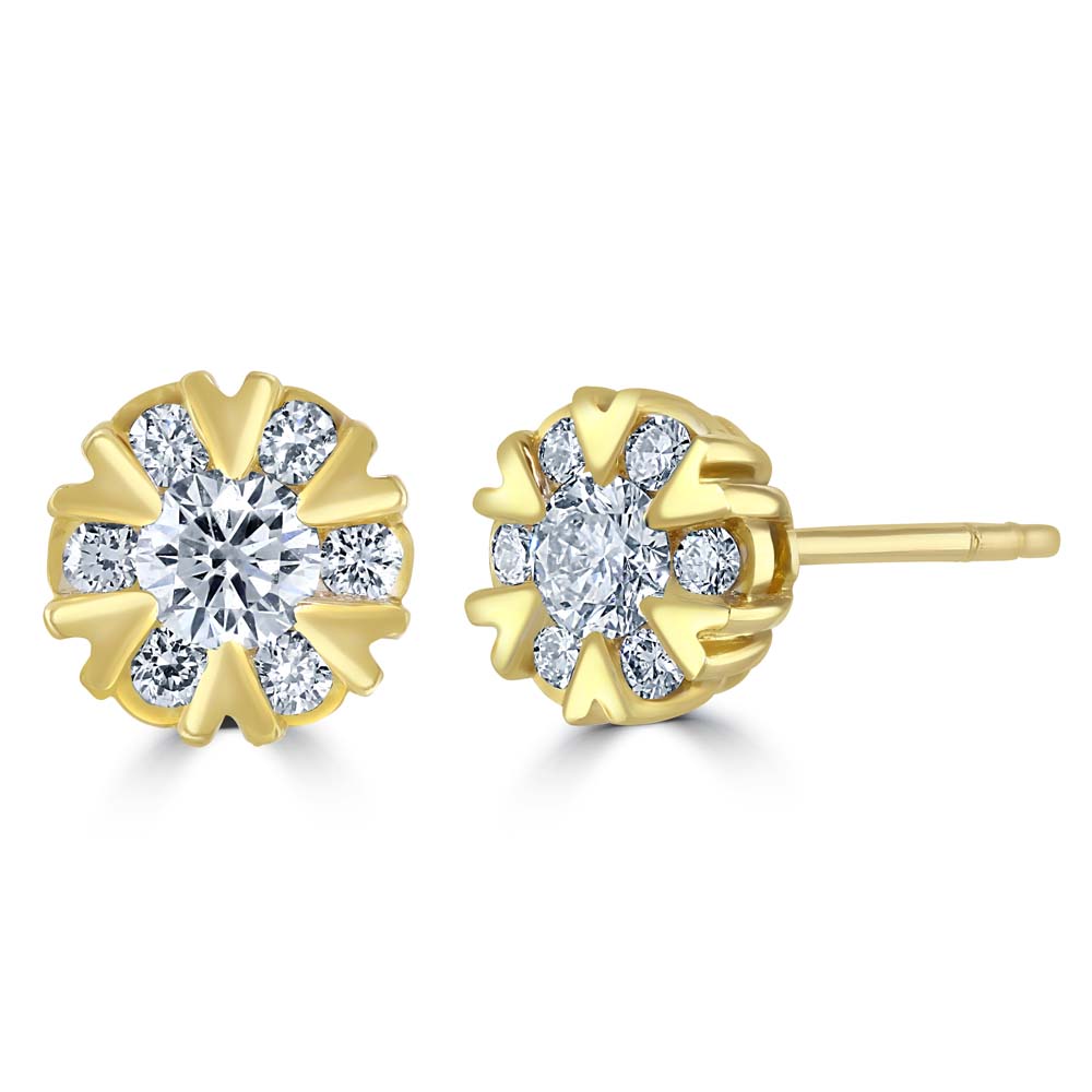 Discover the romantic charm of our 18ct yellow gold stud earrings, meticulously crafted to capture the essence of elegance and affection. Each earring centres around a radiant round brilliant cut diamond, beautifully framed by six additional round brilliant cut diamonds, totalling 0.47 carats. These diamonds are uniquely set between large heart-shaped claws, adding a touch of whimsy and distinctiveness to the design. The warmth of the yellow gold enhances the brilliance of the diamonds, creating a stunning contrast that's sure to catch the eye. Equipped with post and butterfly fittings, these earrings offer a secure and comfortable fit, perfect for everyday wear or special occasions. Whether as a thoughtful gift or a treat for yourself, these heart-claw stud earrings are a splendid addition to any jewellery collection, symbolizing love and timeless beauty.
