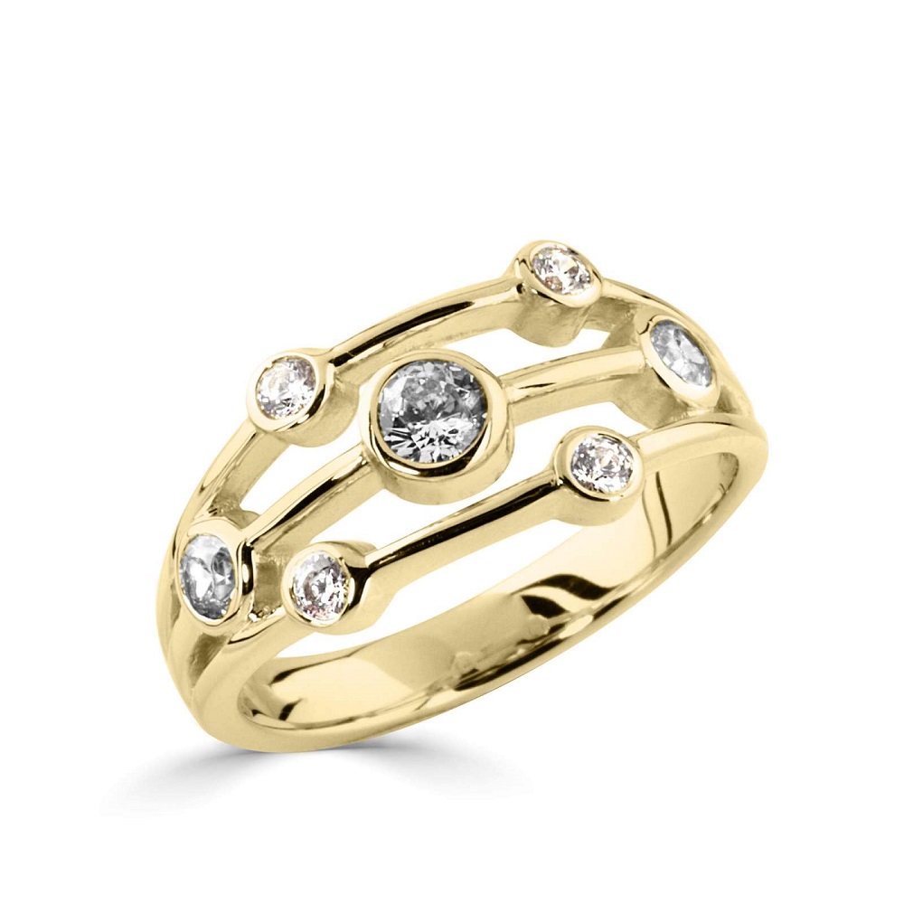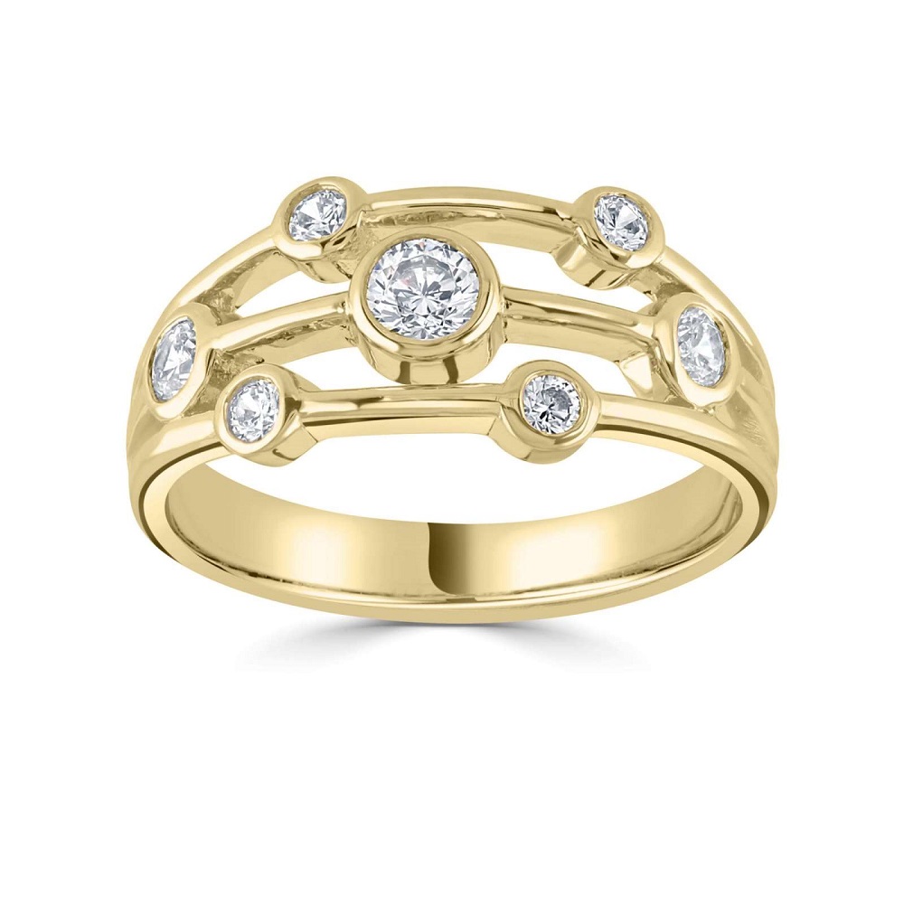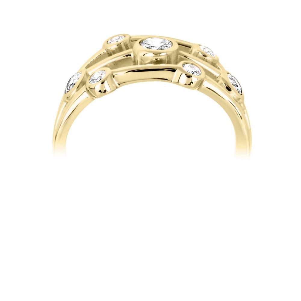 Introducing our stunning 18ct yellow gold three strand ring, a masterpiece of contemporary design and sparkling elegance. This exquisite ring features three interwoven strands of lustrous yellow gold, each rubover set with an array of scattered round brilliant cut diamonds in varying sizes. With a total diamond weight of 0.44 carats, this ring dazzles from every angle, reflecting light with every movement. Perfect for those who appreciate sophisticated style and luxury, this ring is an ideal choice for special occasions or as a chic addition to your everyday wear. Elevate your jewellery collection with this beautifully unique and radiant diamond ring
