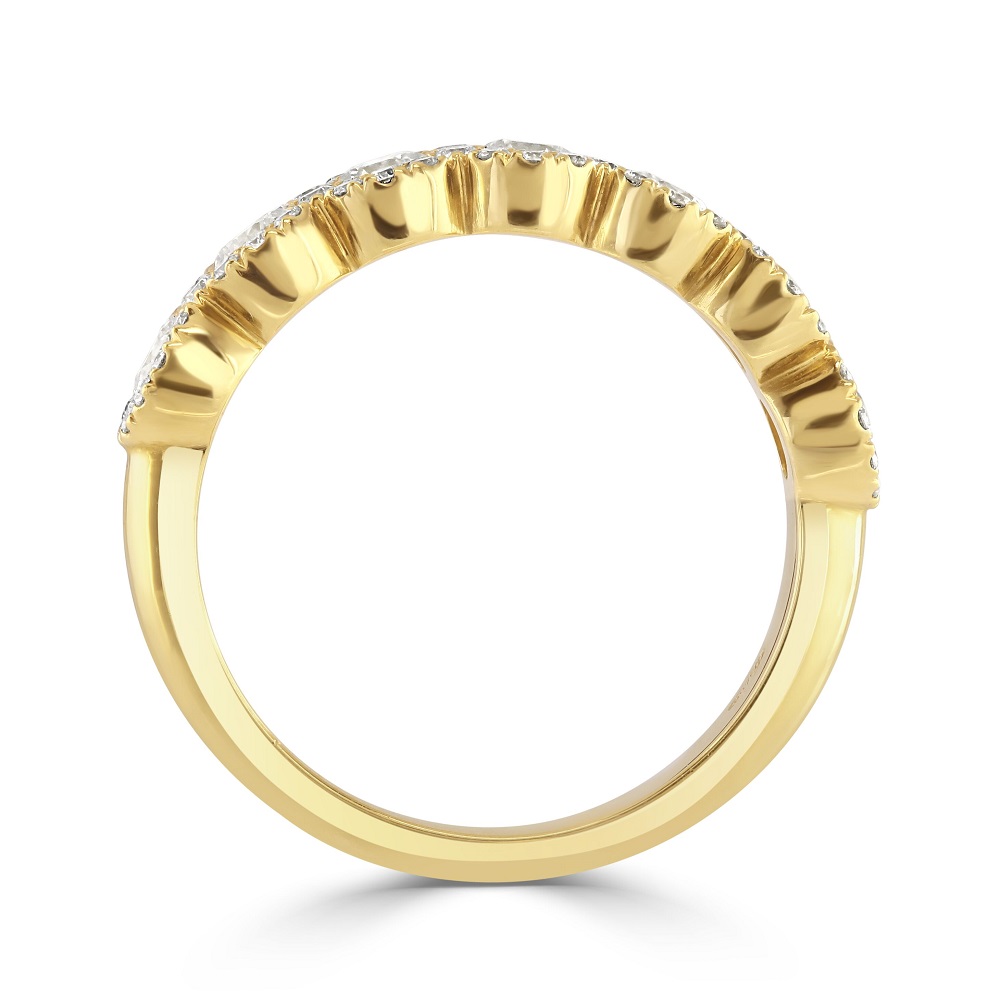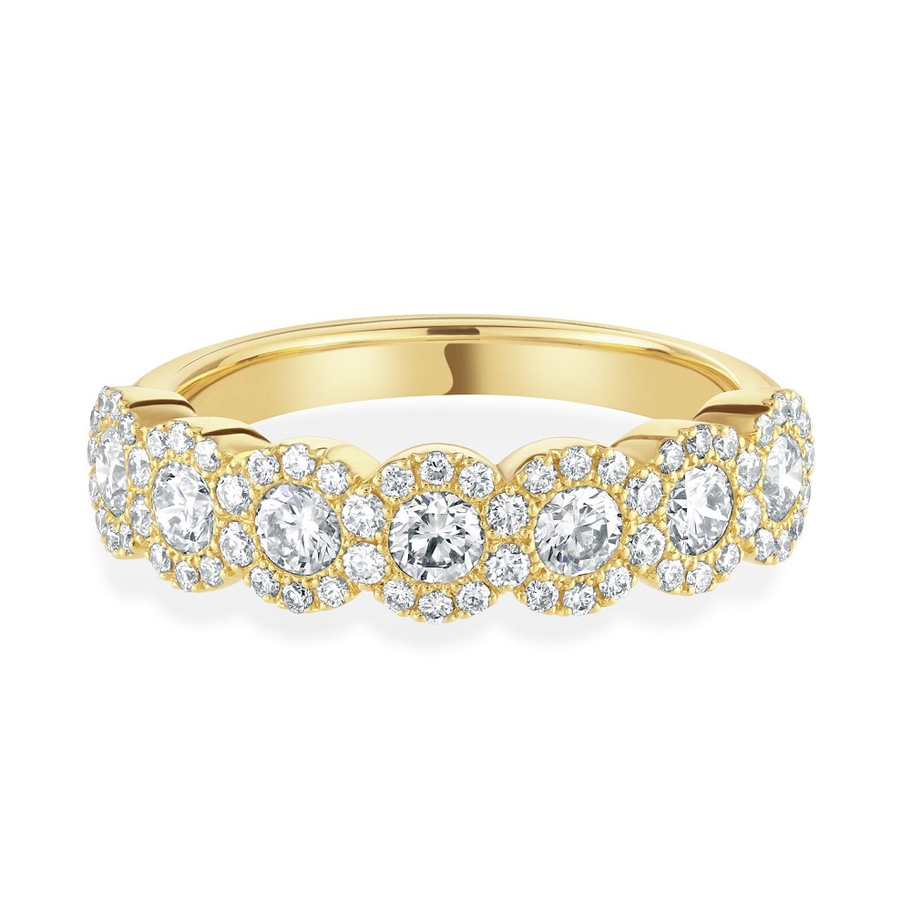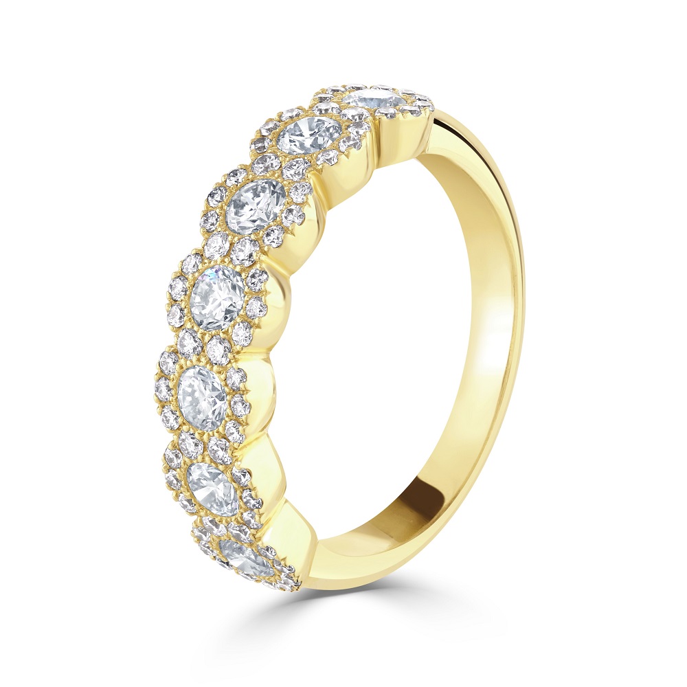 A luxurious 18ct yellow gold half eternity ring, a masterpiece that exudes sophistication and timeless beauty. This exquisite ring features seven round brilliant cut diamonds, each meticulously surrounded by a halo of smaller round brilliant cut diamonds, creating an extraordinary display of sparkle and elegance. With a total diamond weight of 0.79ct, this ring shines with an unparalleled brilliance that captures the essence of luxury.