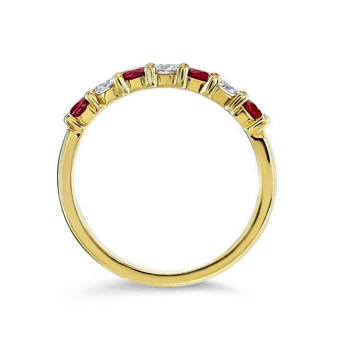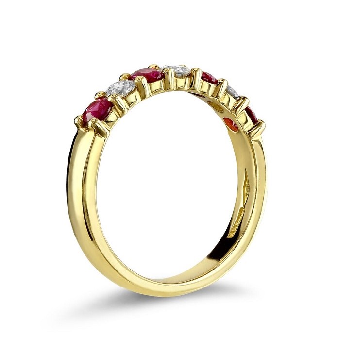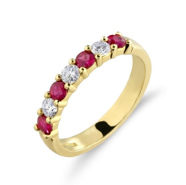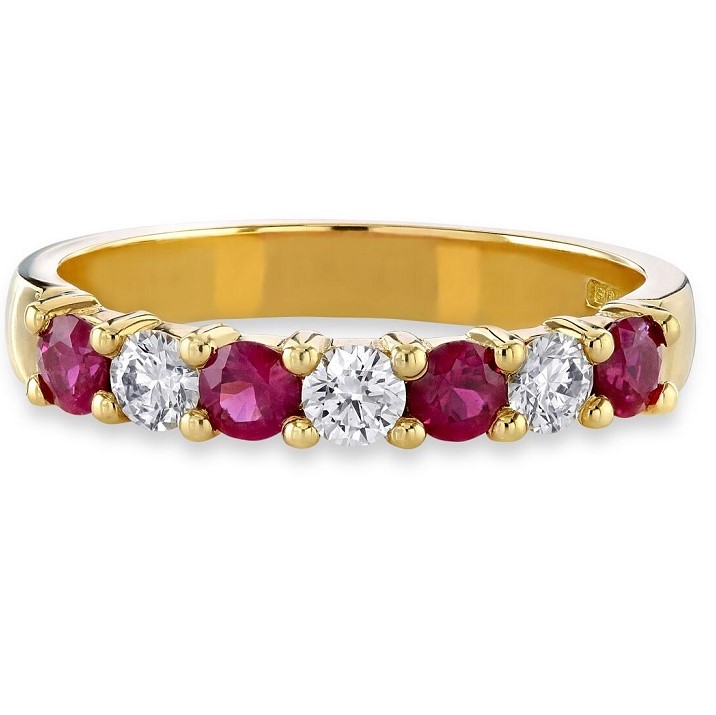 An exquisite 18ct yellow gold eternity ring, a stunning symbol of everlasting love and timeless elegance. This beautifully crafted ring features alternating gemstones in a classic four claw setting—four vibrant round rubies and three dazzling round brilliant-cut diamonds. The rubies, totalling 0.48 carats, exude a deep, rich red, each gem perfectly capturing the essence of passion and commitment. Complementing the rubies, the diamonds provide a total weight of 0.27 carats, their brilliant sparkle enhancing the overall allure of the ring. Ideal for an anniversary gift, wedding band, or a meaningful addition to your jewellery collection, this eternity ring combines the warmth of yellow gold with the luxurious sparkle of diamonds and rubies, creating a piece that is both sophisticated and enchanting.