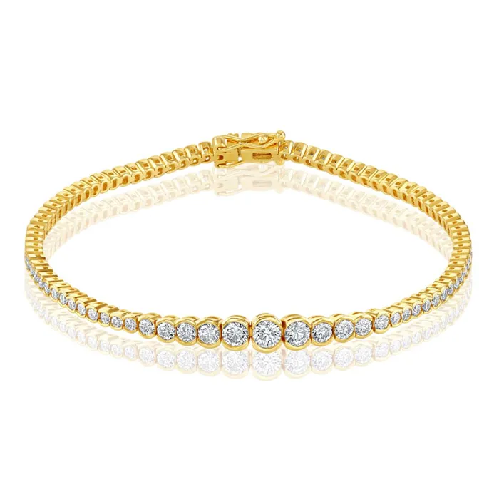 Introducing our luxurious 18ct yellow gold line bracelet, a breathtaking addition to any fine jewellery collection. This exquisite bracelet features 87 graduated round brilliant cut diamonds, each meticulously rubover set to maximize their brilliance and sparkle. The total diamond weight of this piece is an impressive 2.57 carats, offering a dazzling display of light and elegance. Crafted from premium 18ct yellow gold, the bracelet's warm tones beautifully complement the radiant diamonds, creating a sophisticated and timeless look. Secured with a double figure 8 safety clasp, this line bracelet ensures both comfort and security while wearing. Perfect for special occasions or as an opulent daily accessory, this line bracelet is designed for those who appreciate the ultimate in luxury and craftsmanship.