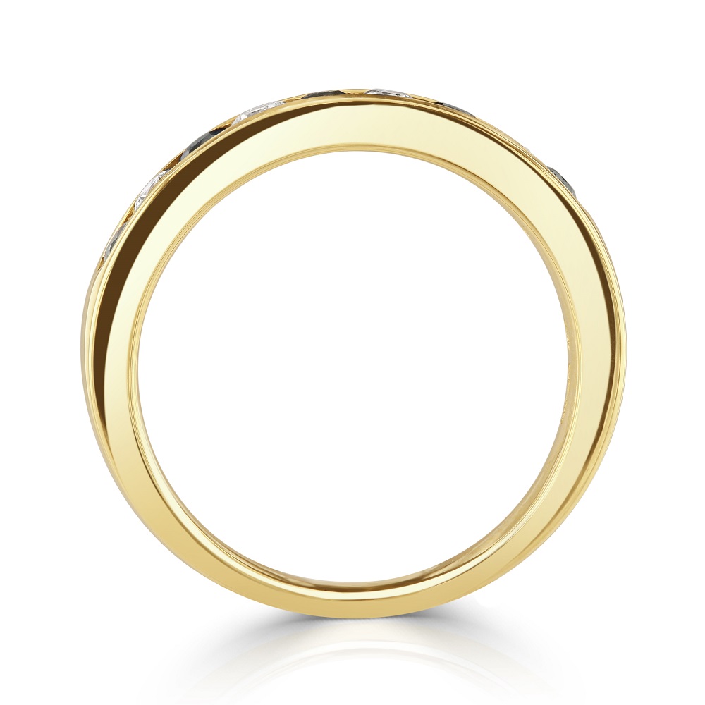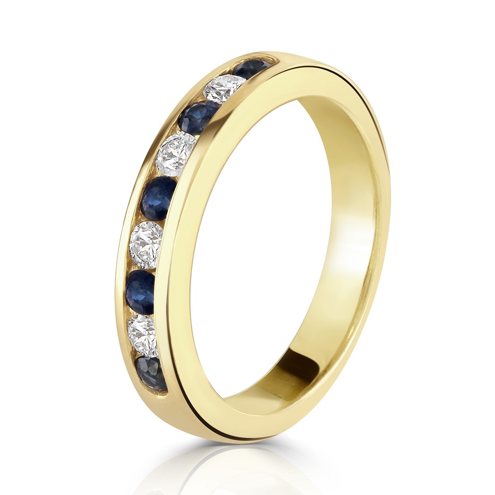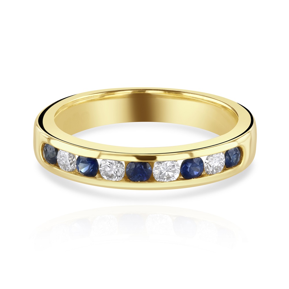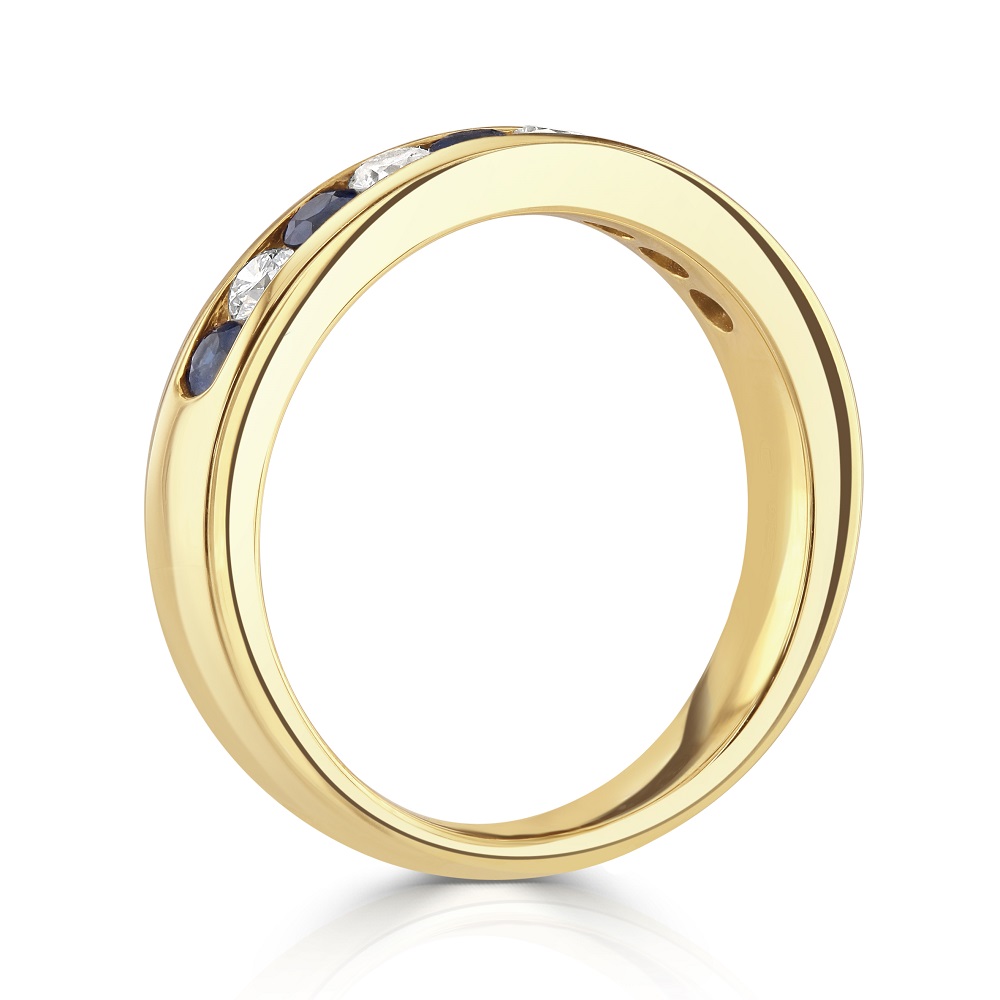 Our 18ct yellow gold half eternity ring is a luxurious symbol of enduring style. This exquisite ring features a seamless channel setting with alternating gemstones, combining the rich allure of five round sapphires with the sparkling brilliance of four round brilliant cut diamonds.