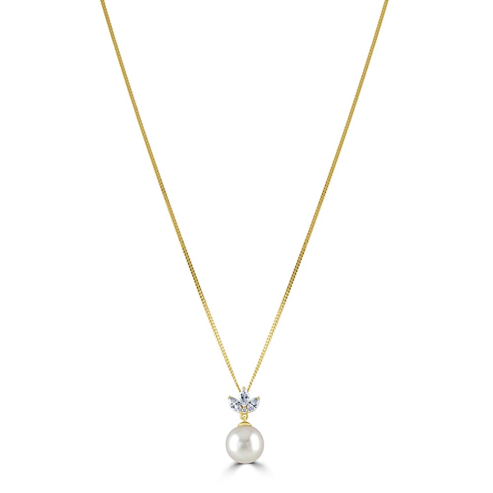 Discover the delicate charm of our 18ct yellow gold pendant, featuring a lustrous Akoya cultured pearl, gracefully suspended from a refined 16-inch curb chain. This elegant pendant highlights a single pearl, measuring between 8.0 and 8.5mm in diameter, renowned for its smooth surface and exquisite sheen. Above the pearl, three marquise cut diamonds are arranged in a leaf motif, adding a touch of natural beauty and a total diamond weight of 0.22 carats. These diamonds are expertly cut to maximize their brilliance, reflecting light beautifully and complementing the soft glow of the pearl. The entire piece is crafted in luxurious 18ct yellow gold, which enhances the warm tones of the pearl and the sparkle of the diamonds. The classic curb chain provides a secure and stylish means of wear, perfect for both special occasions and everyday elegance. This pendant is a splendid choice for those who appreciate the timeless beauty of pearls paired with the sophistication of diamonds, making it an ideal gift or a special addition to any jewellery collection. Embrace this piece's blend of classic allure and contemporary craftsmanship.