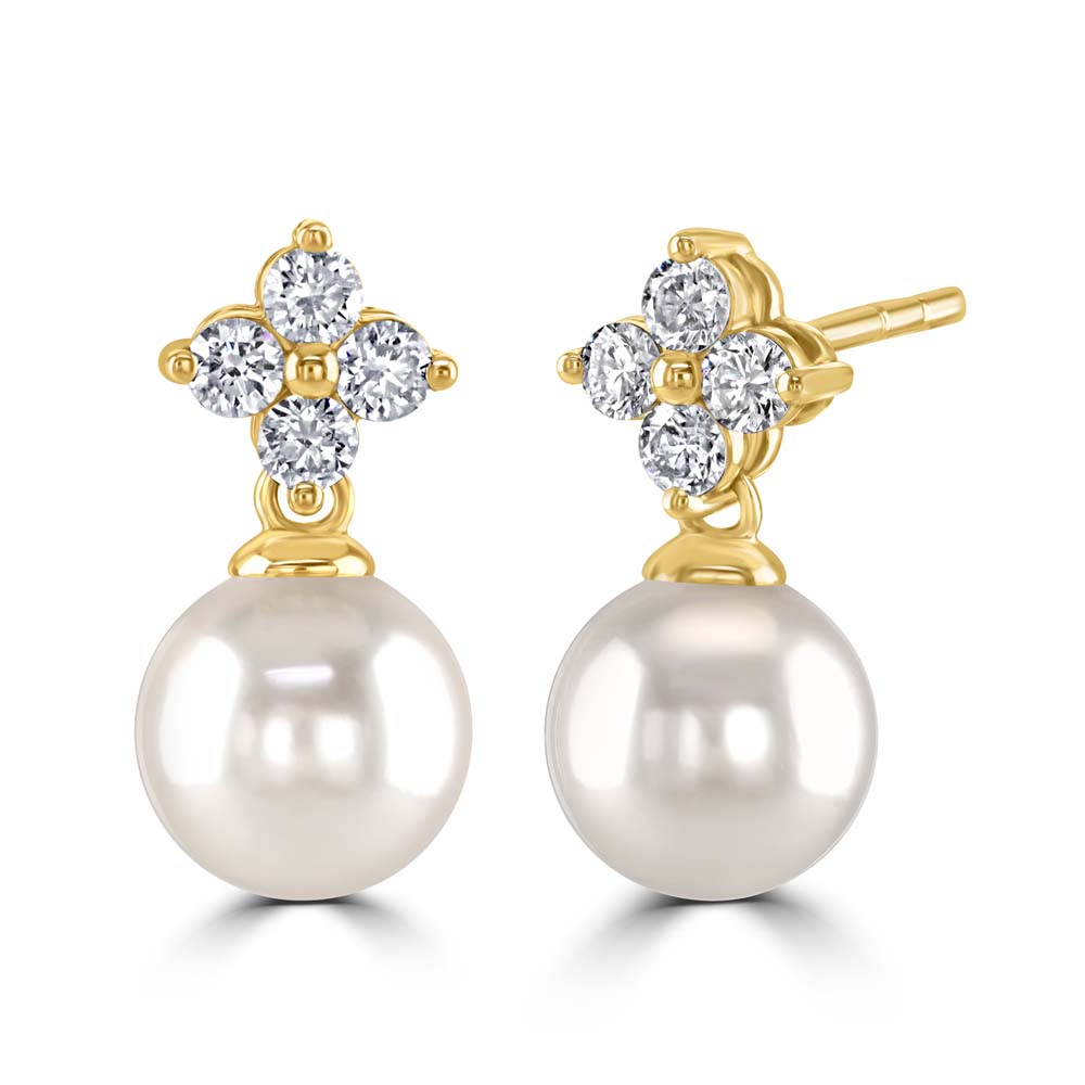 Discover the refined elegance of our 18ct yellow gold drop stud earrings, a stunning addition to any luxury jewellery collection. Each earring features a lustrous Akoya cultured pearl gracefully suspended beneath a delicately crafted flower composed of four claw-set round brilliant-cut diamonds. The flawless arrangement highlights the natural beauty and shimmer of both the pearls and the diamonds, creating a sophisticated and timeless piece. The Akoya pearls, known for their exceptional quality and impressive size ranging from 8.0 to 8.5mm in diameter, exude a classic elegance that is beautifully complemented by the sparkle of the diamonds, which have a total weight of 0.40 carats. The 18ct yellow gold setting enhances the brilliance of the diamonds and adds a modern touch to these exquisite earrings. Equipped with secure post and butterfly fittings, these earrings ensure comfort and stability for all-day wear. Whether accessorizing for a special event or enhancing your daily wardrobe, these pearl and diamond drop stud earrings promise to offer a touch of sophistication and luxury that will captivate and charm on every occasion.