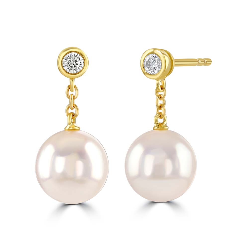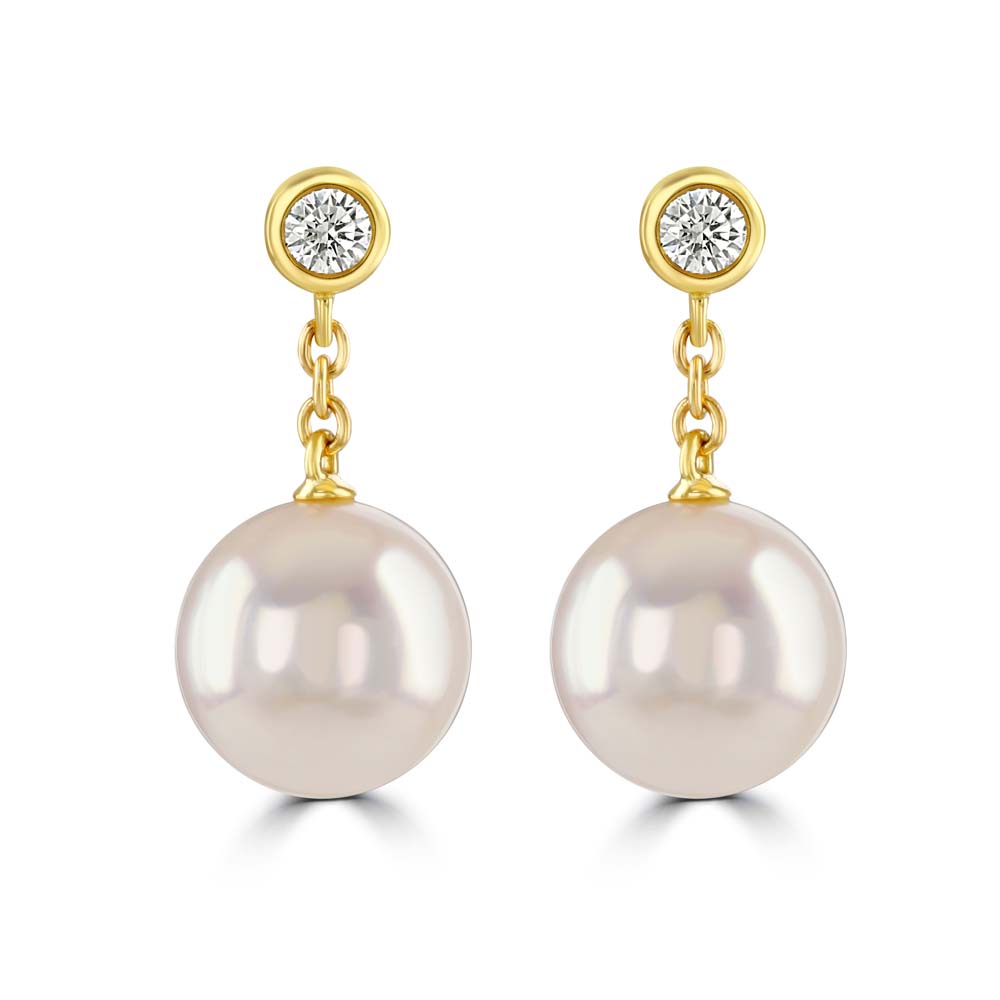 A beautiful pair of 18ct yellow gold pearl and diamond earrings by Mikimoto, the foremost producer of the finest quality cultured pearls. A gorgeous Akoya cultured pearl suspended by a short 18ct yellow gold chain from a single sparkling round brilliant cut diamond. Other variations are available, please contact the store for more details.