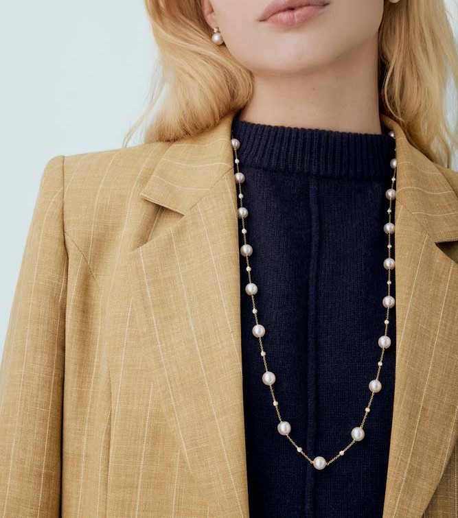 Presenting our luxurious 18ct yellow gold chain necklet, a striking ensemble of elegance and sophistication. This magnificent piece features an 80cm chain adorned with alternating Akoya cultured pearls and rubover-set round brilliant cut diamonds. It includes 22 pearls, each measuring between 8.5 to 9.0mm in diameter, complemented by 23 diamonds with a total weight of 0.92ct. Crafted in lustrous yellow gold, this necklet enhances any ensemble, providing a classic yet contemporary appeal. Perfect for special occasions or as an exquisite gift, this yellow gold necklet is a timeless addition to any jewellery collection.