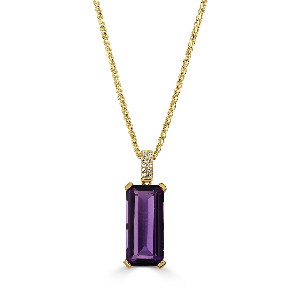 A timeless 18ct yellow gold pendant, featuring a long octagonal amethyst, weighing an impressive 4.44cts, which has a deep, rich purple hue and captivating clarity. This stunning gemstone is securely held in place by a four-claw setting, ensuring its brilliance is showcased from every angle. Elevating the elegance of this pendant, the amethyst is topped with a beautifully crafted bale, adorned with two rows of round brilliant cut diamonds. These diamonds have been meticulously selected for their radiant sparkle, adding a layer of opulence and allure to the pendant. Their exceptional brilliance perfectly complements the deep purple of the amethyst, creating a striking contrast that is both elegant and eye-catching. This luxurious pendant is suspended from an 18ct yellow gold 16-inch spiga chain. The choice of this chain not only enhances the pendant's visual appeal but also ensures it sits beautifully and securely around the neck.