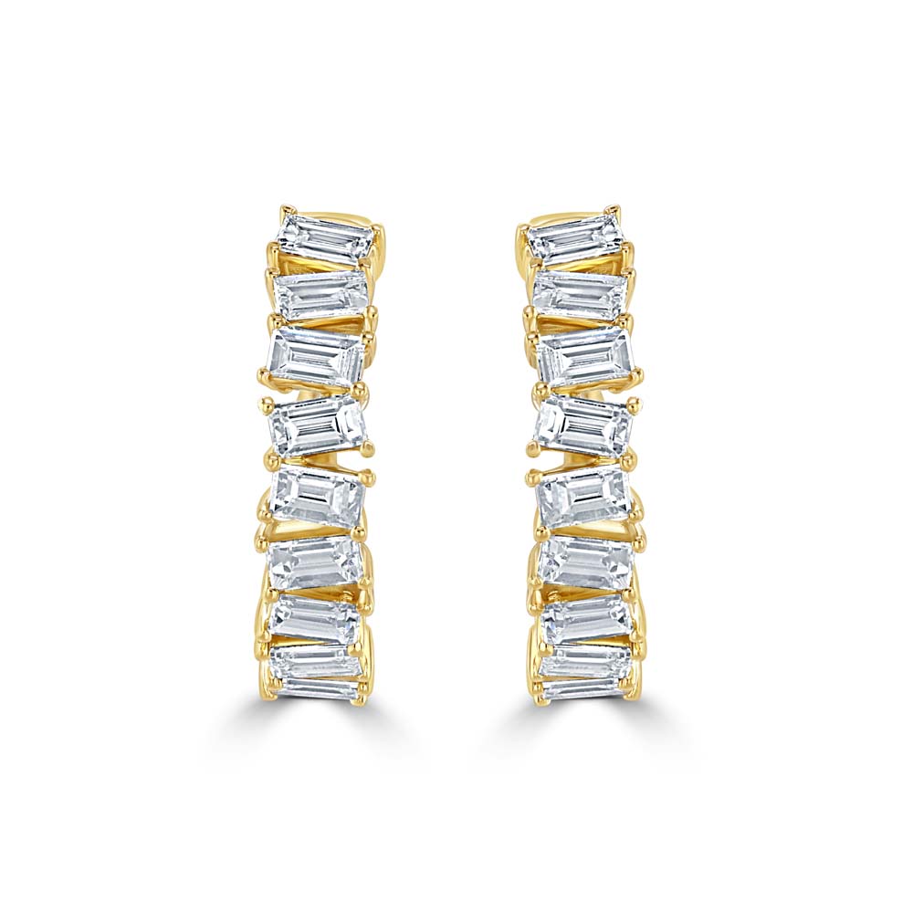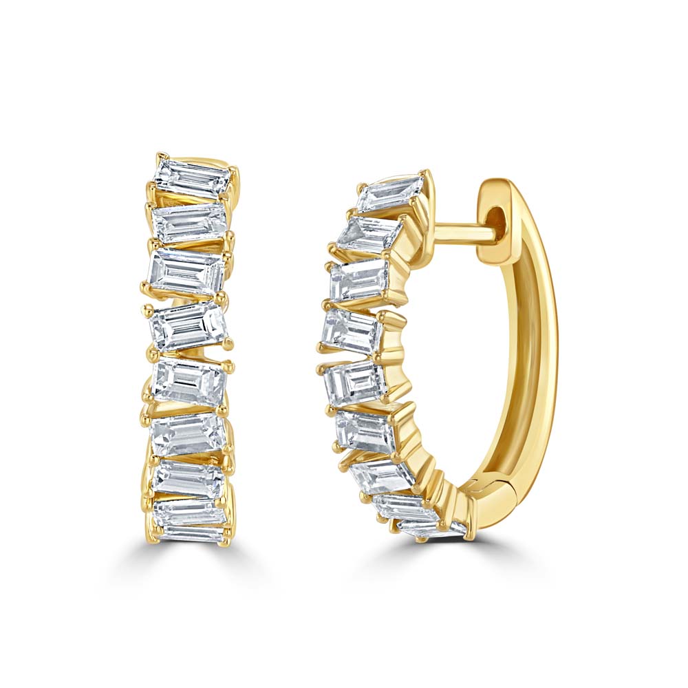 Elevate your jewellery collection with these striking 18ct yellow gold hinged hoop earrings, designed to showcase modern elegance and timeless luxury. Each hoop features nine claw-set baguette cut diamonds, arranged in a distinctive zigzag pattern that catches the light beautifully and adds dynamic sparkle to every movement. With a total diamond weight of 0.80ct, these earrings offer a bold yet refined statement, perfect for both day-to-night wear and special occasions. The hinged design ensures a secure and comfortable fit, making them a versatile addition to any fine jewellery collection.