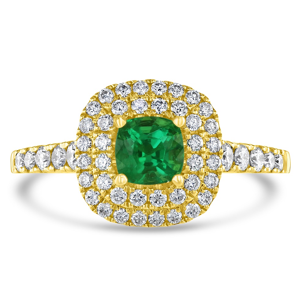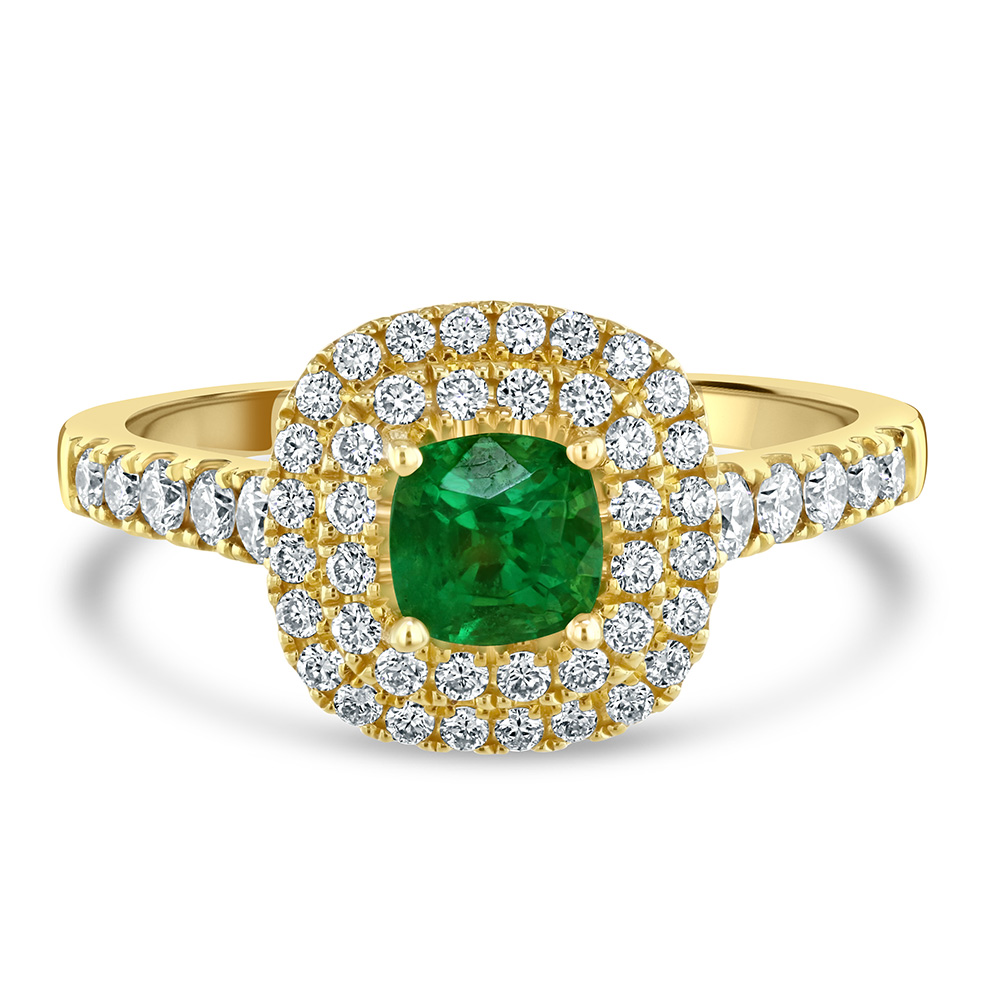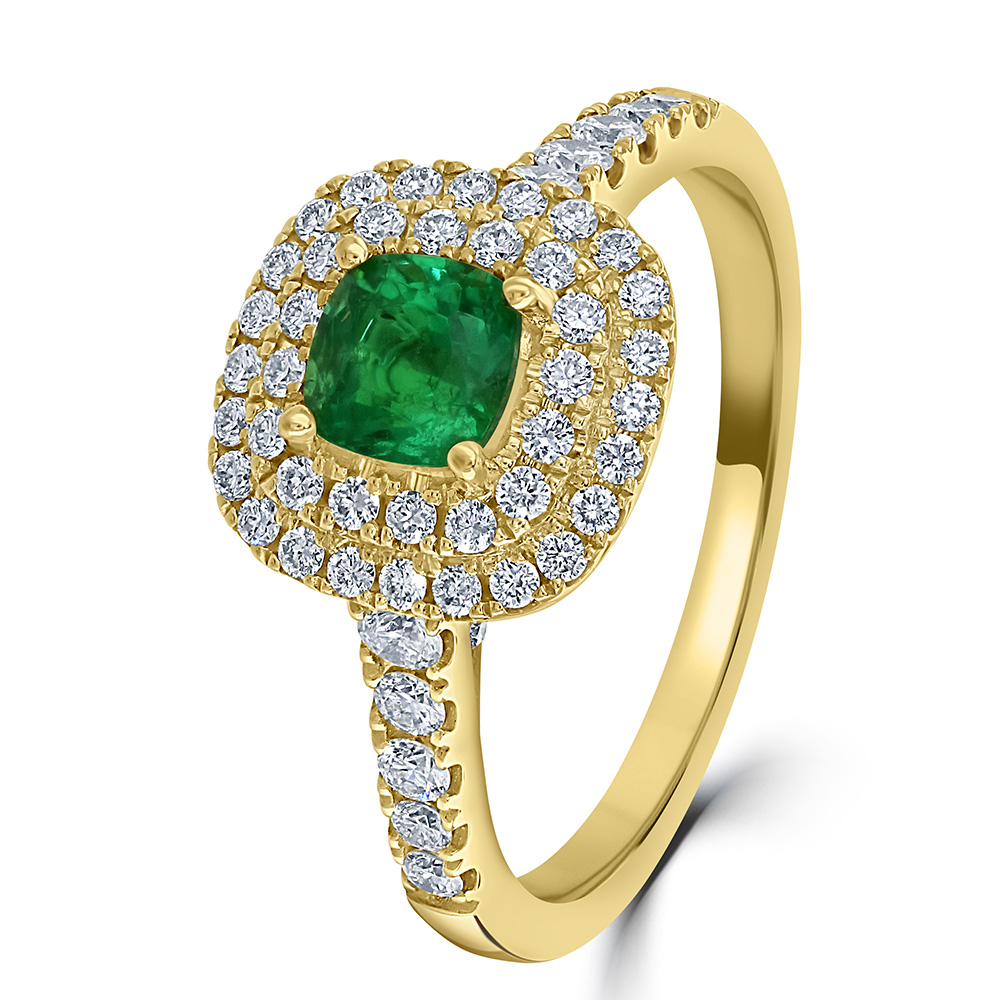Our stunning 18ct yellow gold halo ring is a masterpiece of craftsmanship and elegance. At its heart, a breathtaking 0.55ct cushion-cut emerald takes centre stage, securely held in place by four polished claws. This vibrant green gemstone is encircled by not just one, but two rows of meticulously set round brilliant-cut diamonds, amplifying the ring's radiant beauty. Both the shoulders and under bezel of the ring are adorned with additional diamonds, bringing the total diamond weight to an impressive 0.57ct. Perfect for engagements, milestones, or as a lavish gift, this ring is a symbol of everlasting love and refined taste. Unlock the essence of beauty and grace with this exquisite piece that's sure to capture hearts and turn heads.