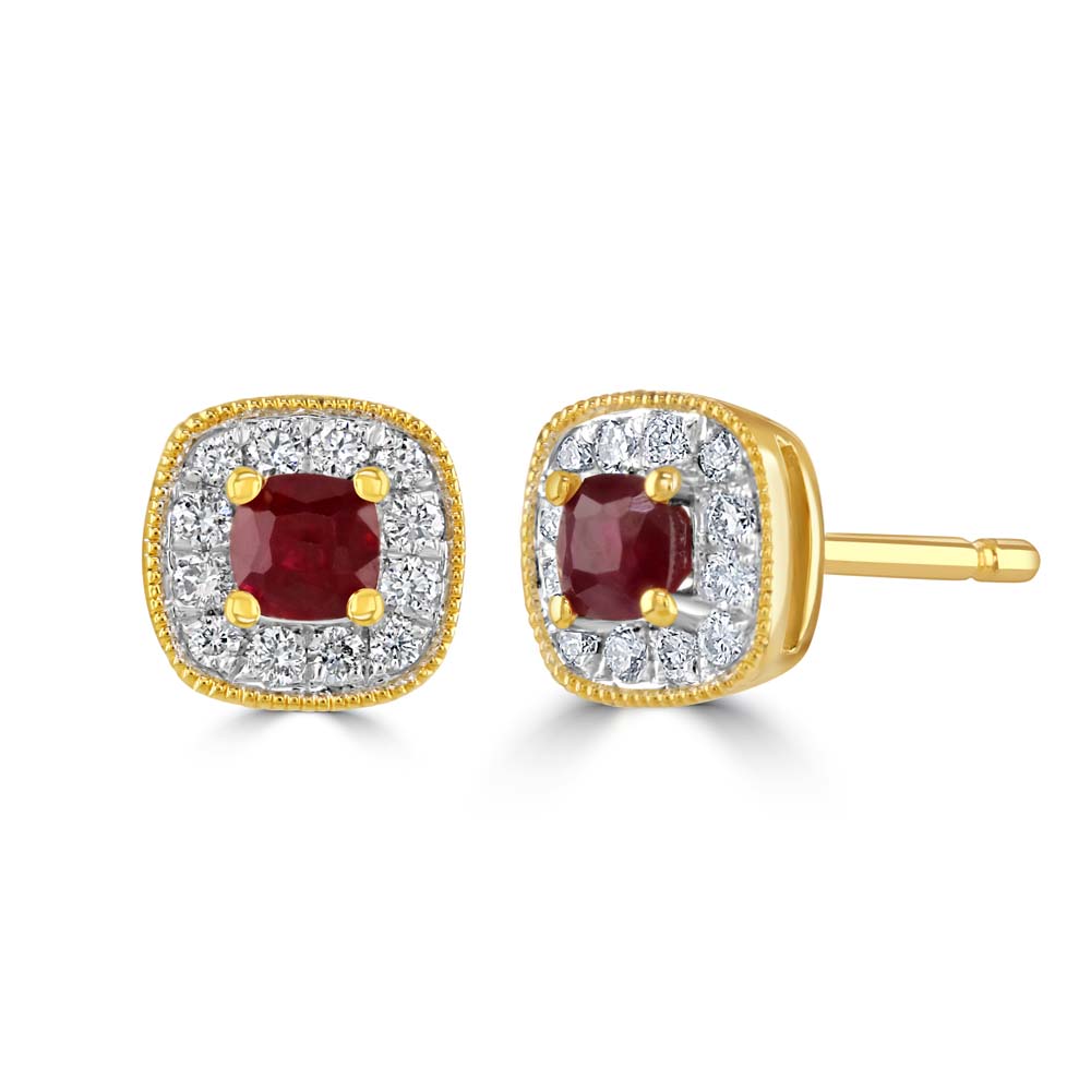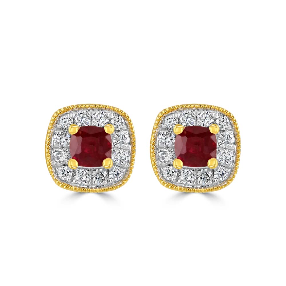 Embrace timeless elegance with our 18ct yellow gold stud earrings, each featuring a captivating cushion cut ruby at the centre, securely set in a four-claw setting. Surrounding the vibrant ruby, a halo of pavé set round brilliant cut diamonds adds a dazzling sparkle, accentuated by a delicate milgrain edge. With a total ruby weight of 0.32ct and a total diamond weight of 0.15ct, these earrings are the epitome of luxury and sophistication. Designed with post and butterfly fittings, they offer both comfort and a secure fit for pierced ears. Enhance your jewellery collection with these exquisite yellow gold ruby and diamond stud earrings, perfect for adding a touch of elegance to any ensemble.