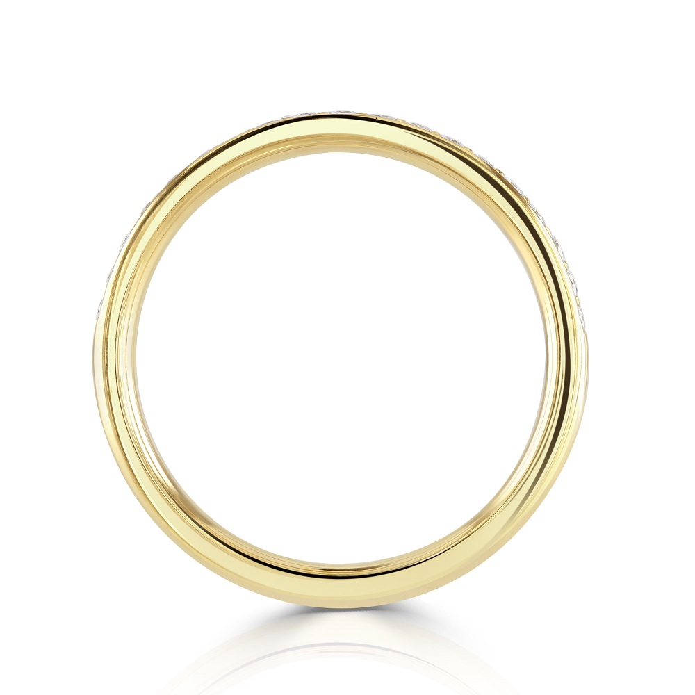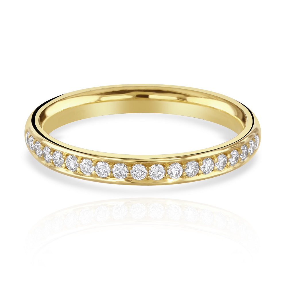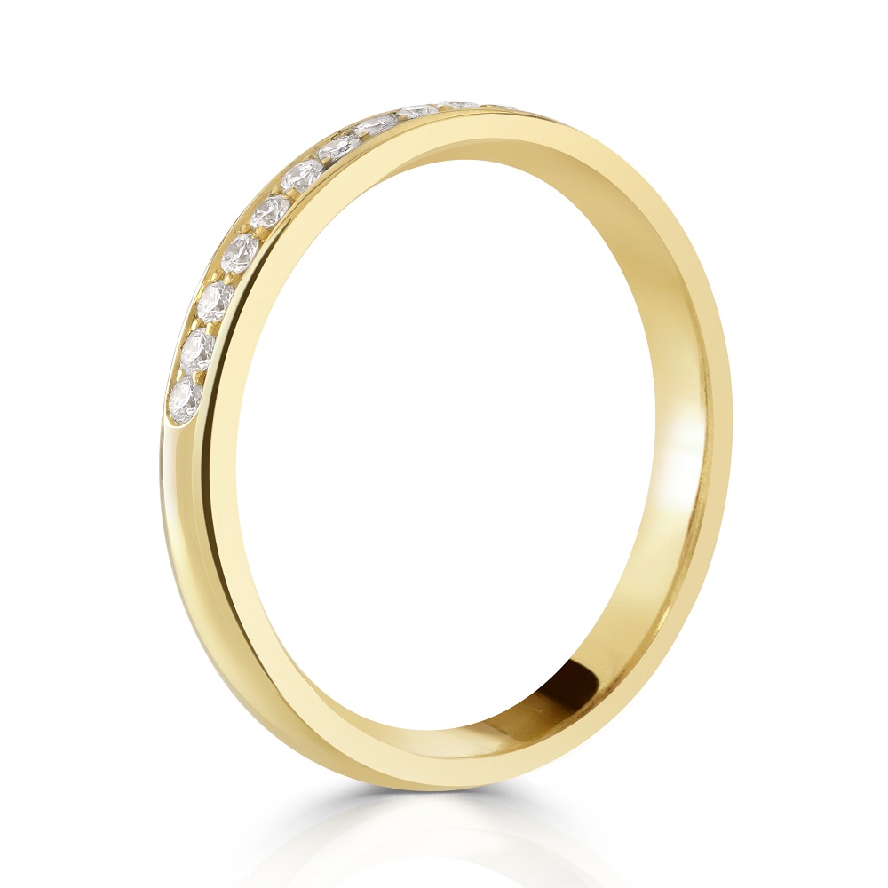 An elegant 18ct yellow gold court-shaped wedding ring, a timeless symbol of love and commitment, meticulously crafted for lasting beauty. This exquisite ring features a 2.5mm band, shaped in a traditional court style for comfort and enduring appeal, with a gentle curve both inside and out ensuring a perfect fit. Enhancing its elegance, the band is half micro-claw set with round brilliant-cut diamonds, totalling 0.19 carats. These diamonds are carefully arranged to catch the light from every angle, adding a subtle sparkle that complements the warm glow of the yellow gold. This wedding ring is ideal for those who seek a blend of classic charm and modern sophistication in their symbol of matrimony. Whether worn alone or paired with an engagement ring, it promises to be as enduring as your love, making every day a reminder of your special bond. Perfect for celebrating your wedding, anniversary, or any meaningful occasion, this yellow gold diamond-set wedding ring is a beautiful choice that will cherish for a lifetime.