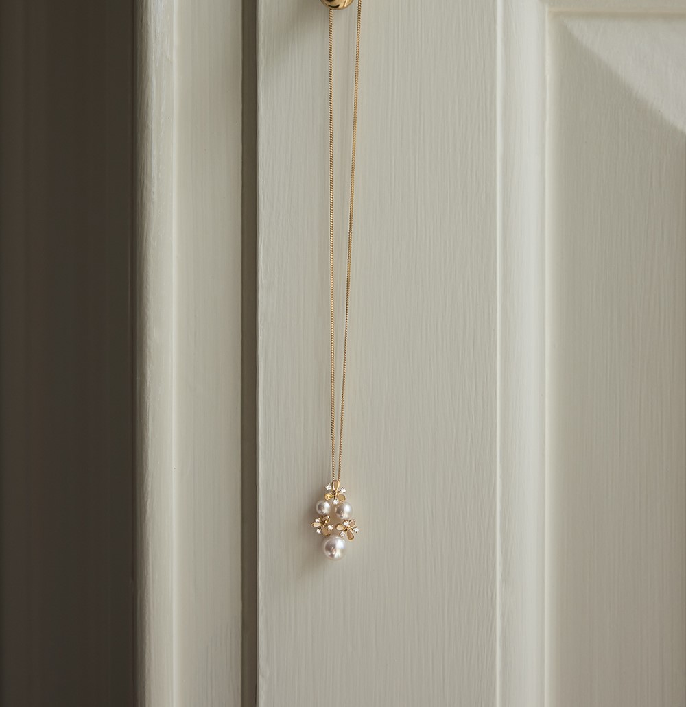 A splendid 18ct yellow gold floral and pearl pendant, a masterpiece that combines the natural beauty of pearls with the timeless elegance of diamonds. This exquisite pendant features three intricately crafted yellow gold flowers, each with alternating petals set with sparkling diamonds totalling 0.15 carats. The design is further enhanced by the placement of two smaller Akoya cultured pearls set above and one larger pearl dangling gracefully beneath.